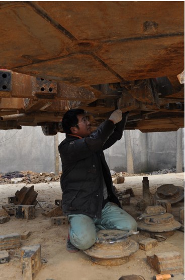 在地下1.4公里的掘进路程,让盾构机从开始的焕然一新到现在浑身都是泥土和锈迹,充满了“奋斗”的痕迹,如同经历了一场大型战役般,现在的盾构机最需要的是休养和调整。据负责人李强介绍,尽管配备专门的维修保养人员,但在盾构机掘进过程中,仍会出现正常的使用损耗,如刀盘的泡沫孔被淤泥堵塞等,只能等到盾构机完全拆卸后才能处理。现在他们的主要工作就是为盾构机去泥、除渣、除锈、刷油,维修损坏部件,进行例行保养。
