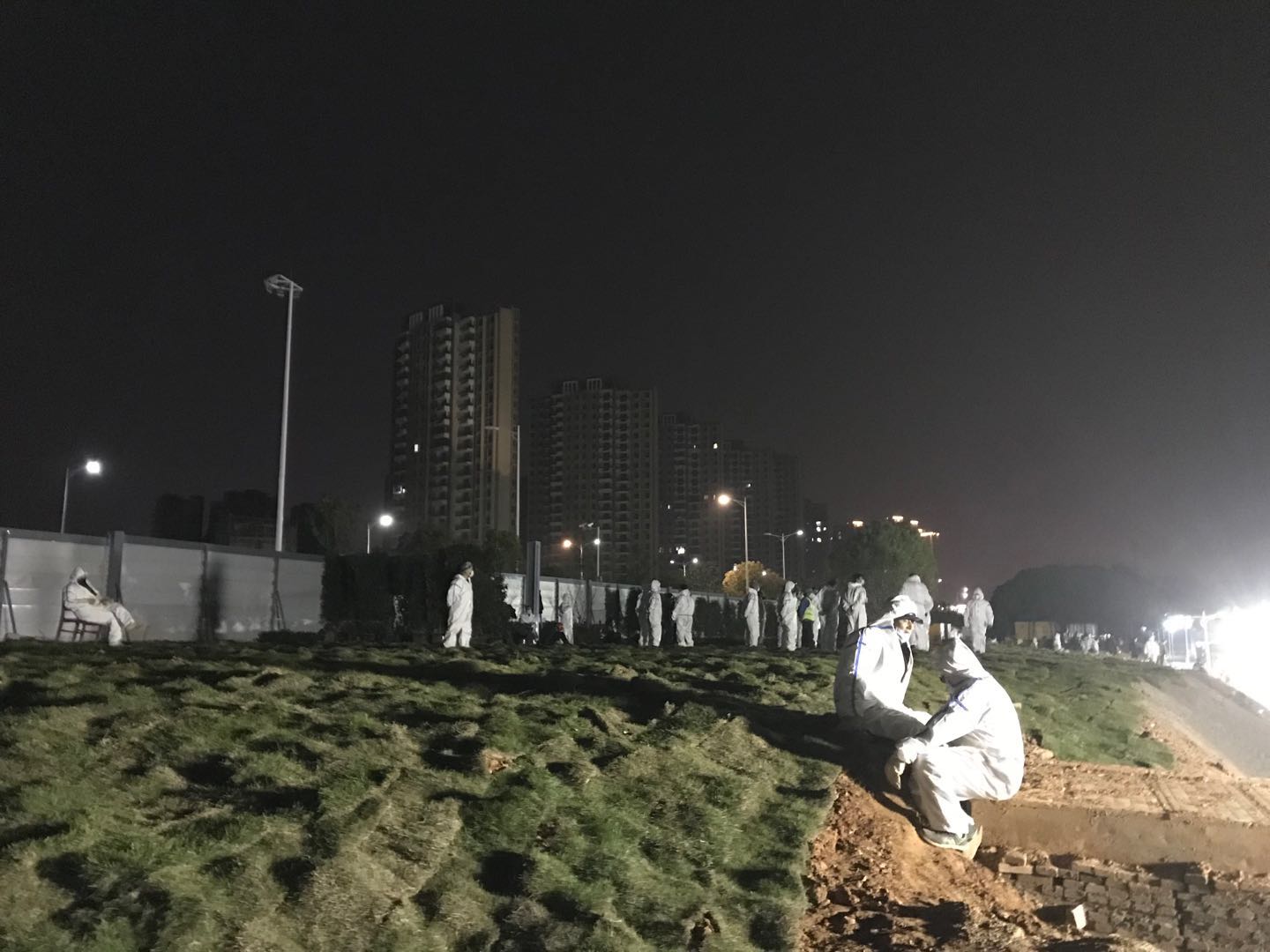 根据施工任务开始组织现场工作,来到火神山第一天,在公司领导的统一指挥下,我们有序完成了火神山医院的初步测量及平整场地工作。夜深回到隔离酒店后,发现爸妈还在等着和我视频,尽管还是不断重复着对我的关心,但是看着他们脸上的表情已不像昨天那样充满着担忧,更多的是支持我,让我注意休息,等我抗疫平安回来。到后面工期更紧,为缩短任务时间,我们整个团队一起争分夺秒地进行一系列工序,昼夜不停地坚守在施工现场;为不影响施工进度,哪怕是暴风雨来袭,大家也依旧没有停歇,铆足干劲,我们彼此加油打气:“就是再累再困也要坚持到底”。最终在团队共同的努力下,我们按时保质完成此了火神山园区24000平方绿化任务。