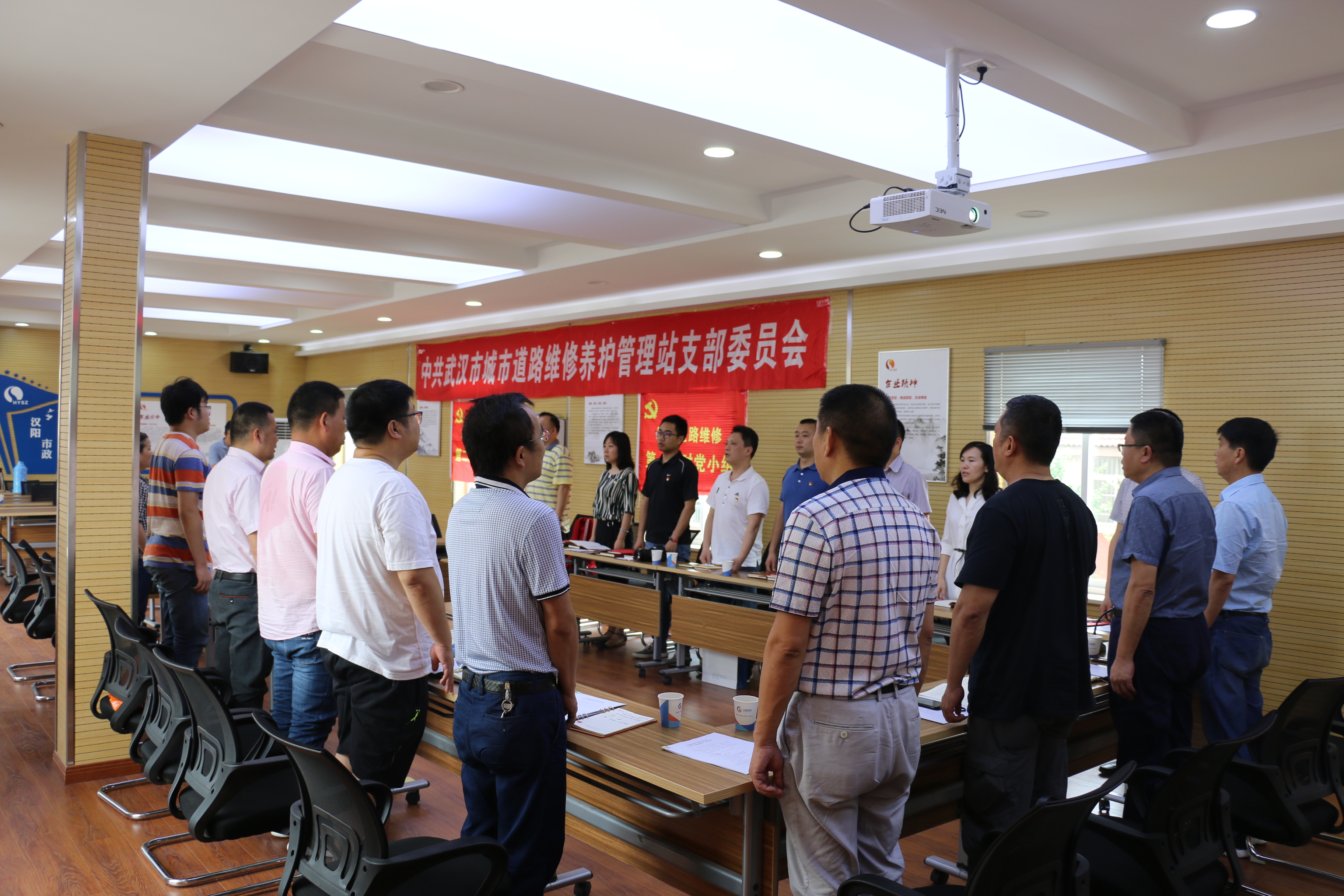 2019年6月6日上午9:00,武汉市道路维修养护管理站联合参建单位汉阳市政维修一队,携手开展六月份主题党日活动。武汉市城建局副局长向晖、市道路维修养护管理站站长李华、副站长汤景舟、丁继斌以及汉阳市政集团有限公司副总经理邢荣斌、汉阳市政维修一队党支部书记兼队长王繁等同志全程参加了本次活动。