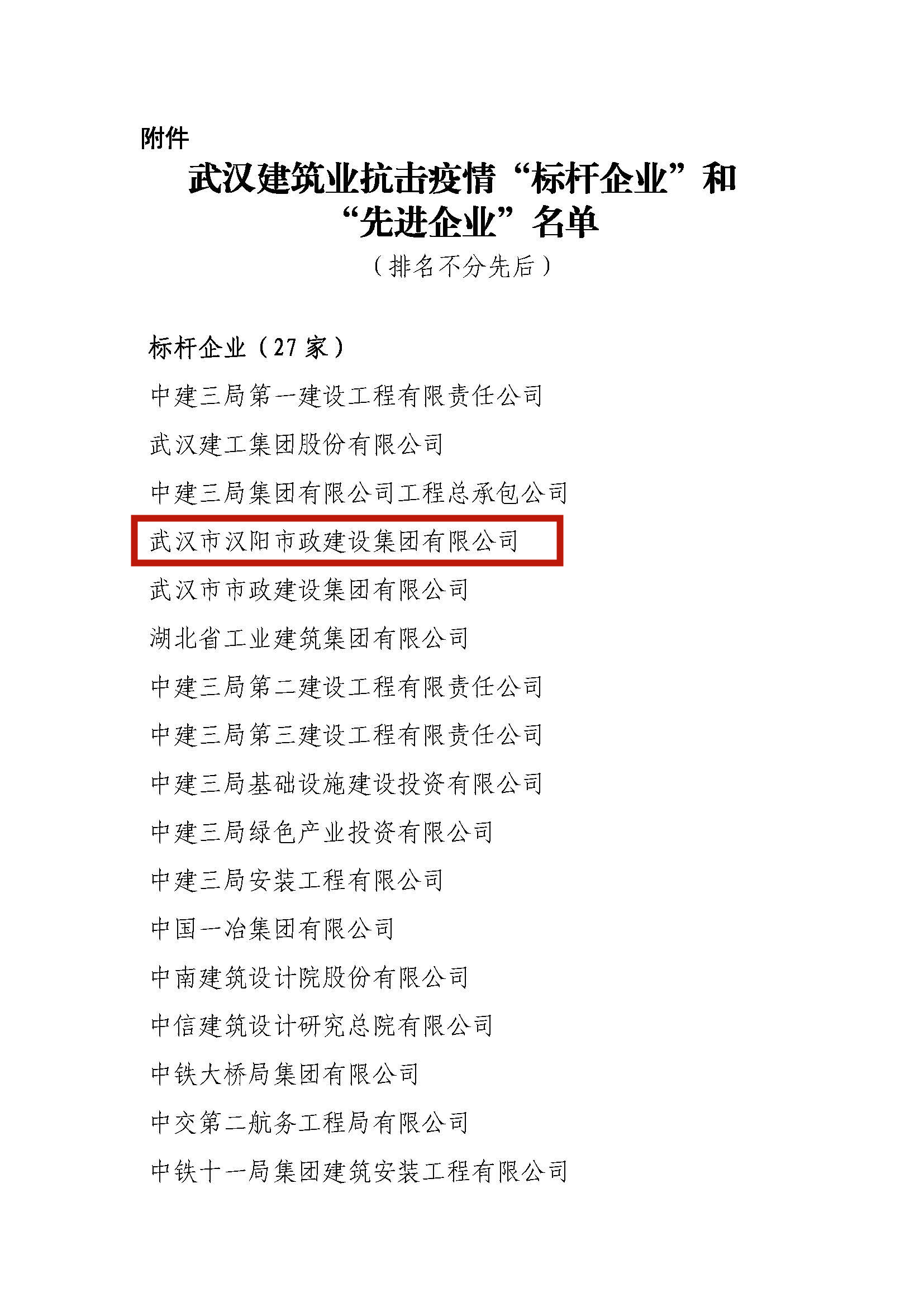 近日,武汉建筑业协会表彰武汉建筑业抗击疫情的“标杆企业”、“先进企业”。其中集团公司荣获“标杆企业”荣誉称号,武汉钟鑫市政建设工程有限公司、武汉博宏建设有限公司、武汉天创市政建设工程有限公司荣获“先进企业”荣誉称号。