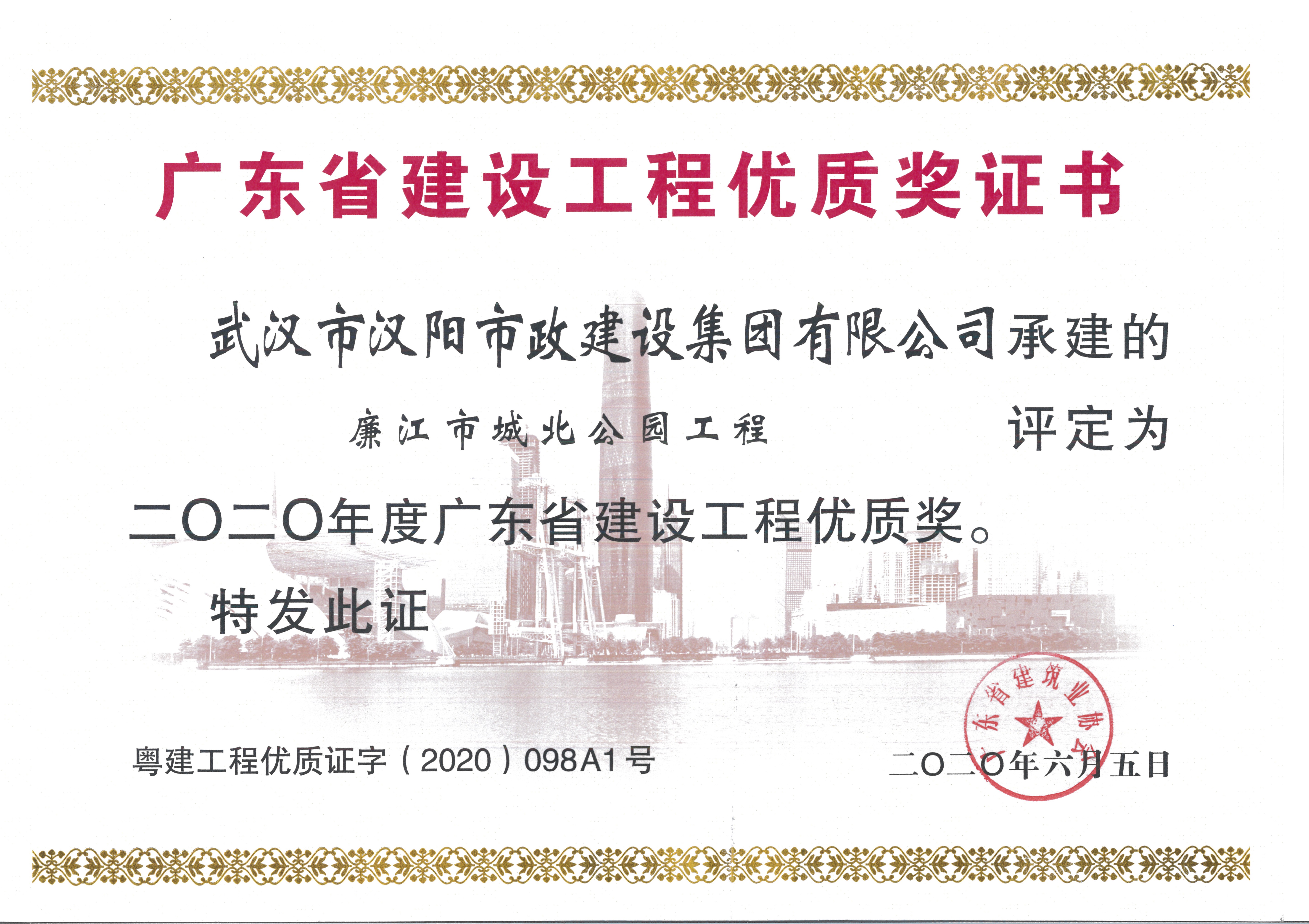 近日,广东省建筑业协会公布了《2020年度广东省建设工程优质奖名单》,由汉阳市政承建的廉江市城北公园工程,荣获广东省建设工程优质奖,此次获奖是汉阳市政在省外获得的最高工程奖项。