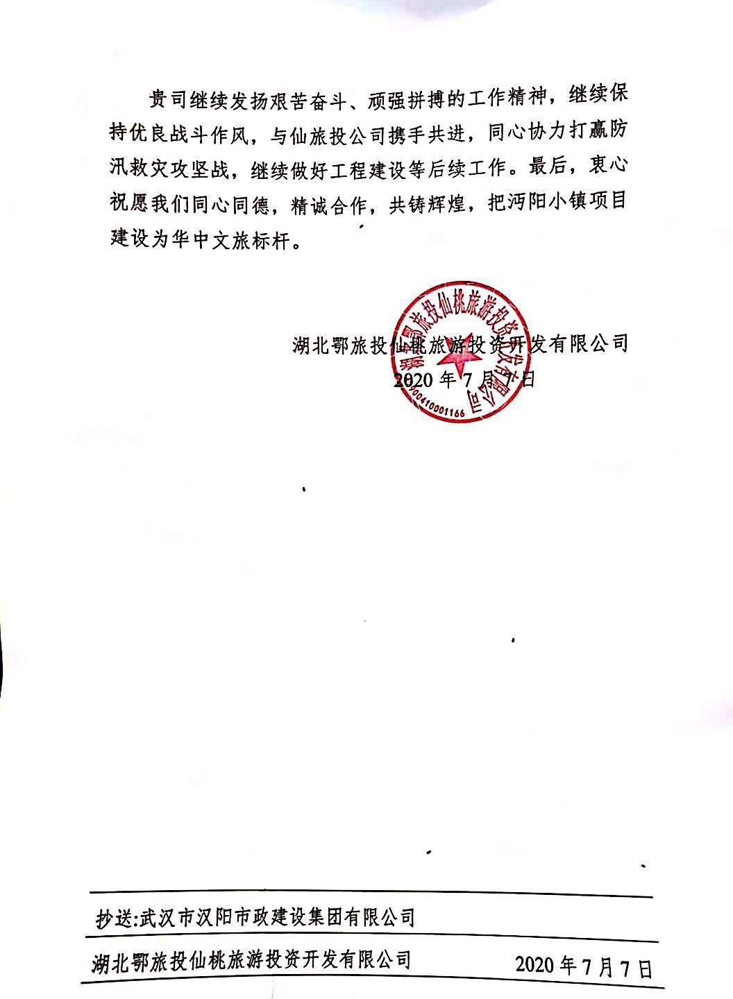 2020年7月7日,鄂旅投仙桃公司给博宏建设送来表扬信,感谢博宏公司在汛情面前,不畏艰险挺身而出,为沔阳小镇筑起生命之堤。