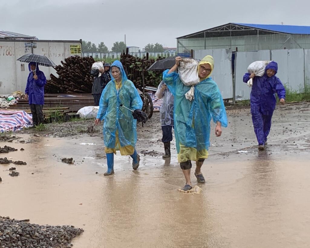 危机面前,博宏公司常务副总经理苏琦紧急赶赴仙桃,迅速组织管理人员及工人近百人,调用大小挖机十余台,全力以赴冒雨抢险,开展防汛救灾。为堵住决口,抢险队员冒着大雨扛着重达50余斤的土石袋,奔走在泥泞不堪的河堤上。随着一袋袋土石运到堤坝上,队员们手拉肩扛用生命筑起“生命之堤”,暂时挡住了汹涌的洪水。但队员们没有时间休憩,为了彻底堵住决口,必须用钢管加固河堤,现场人员又连夜焊接搬运钢管,争分夺秒堵堤抢险。抢险队员们众志成城,万众一心,奋战至7日凌晨1点,最终用钢板堵住了决口处,险情终于得到缓解。