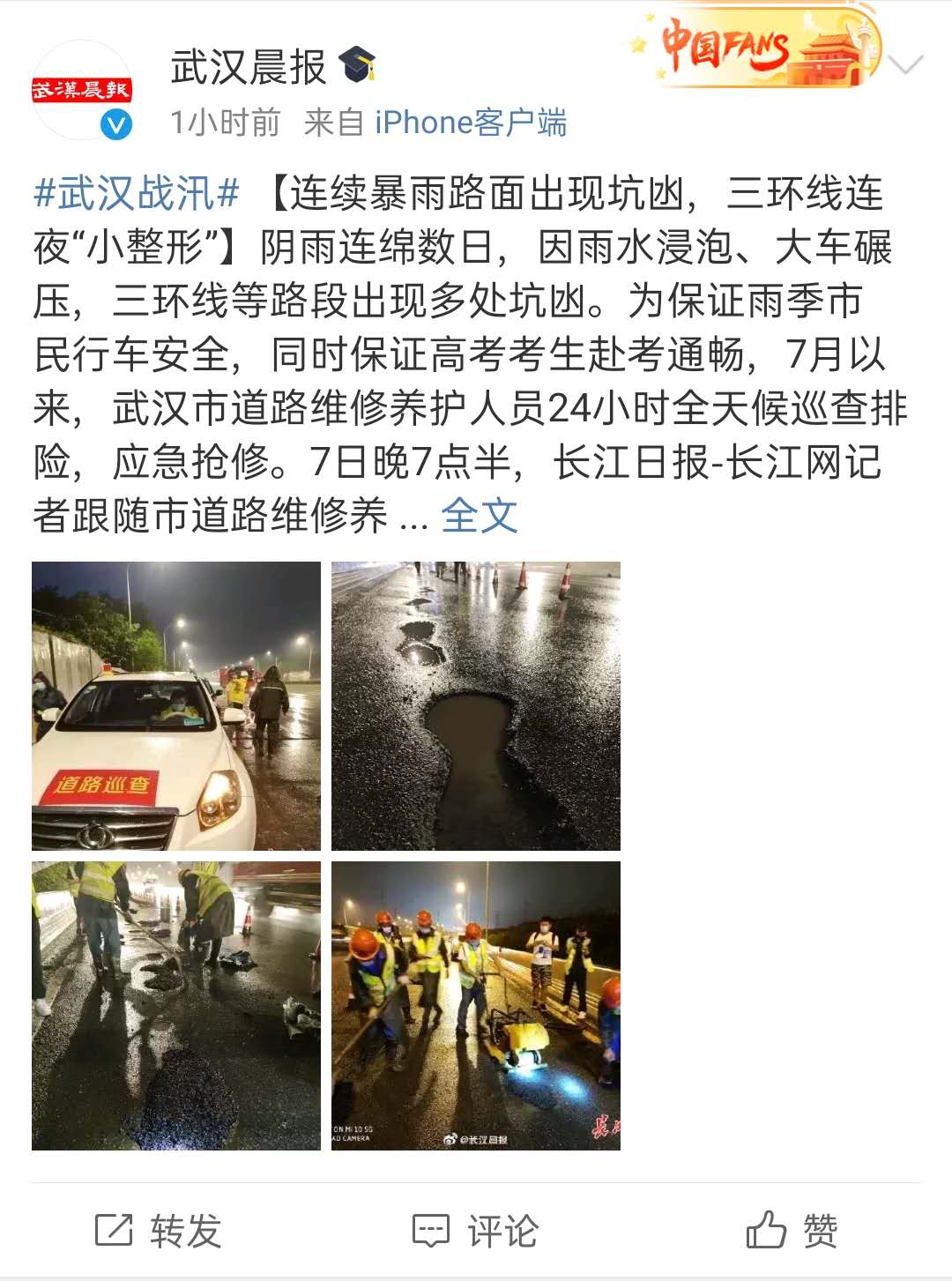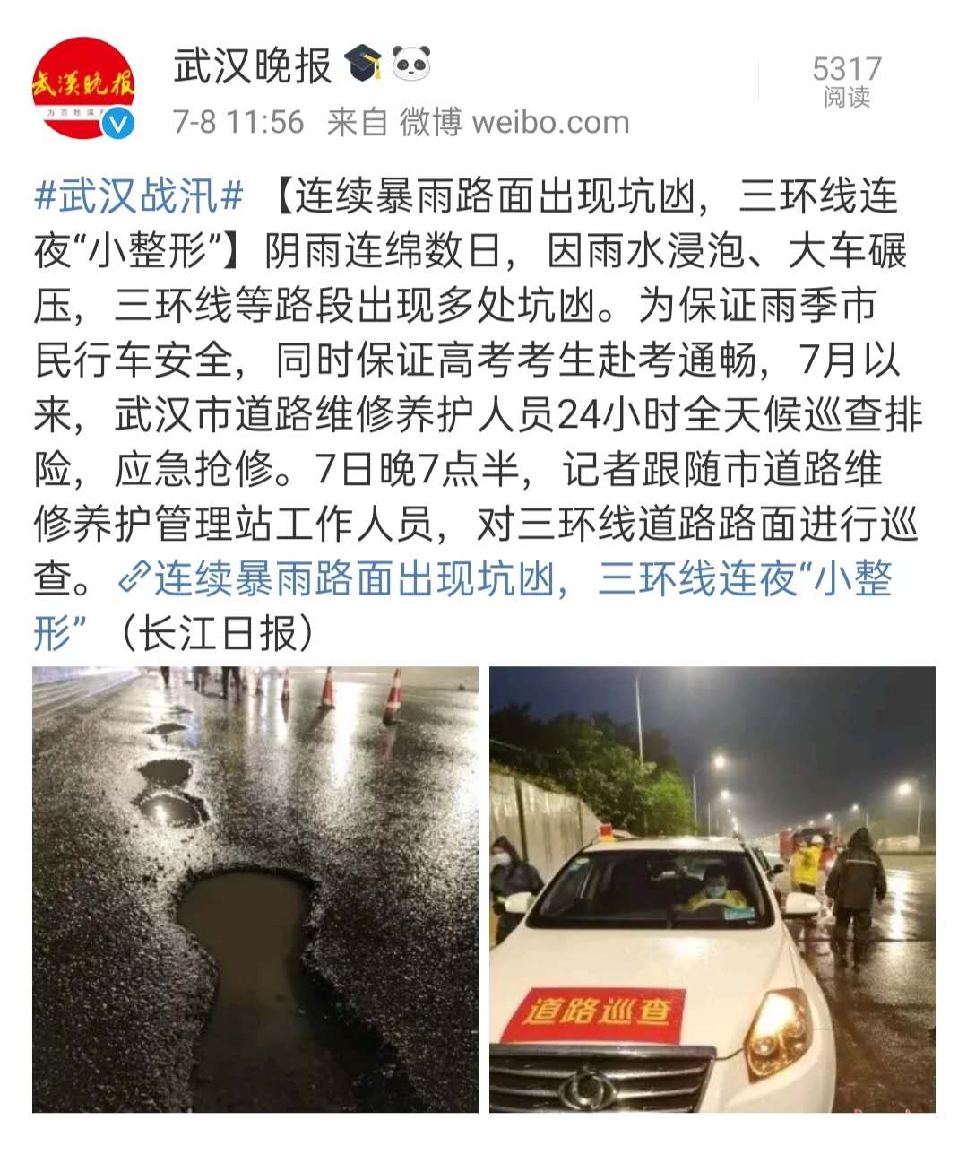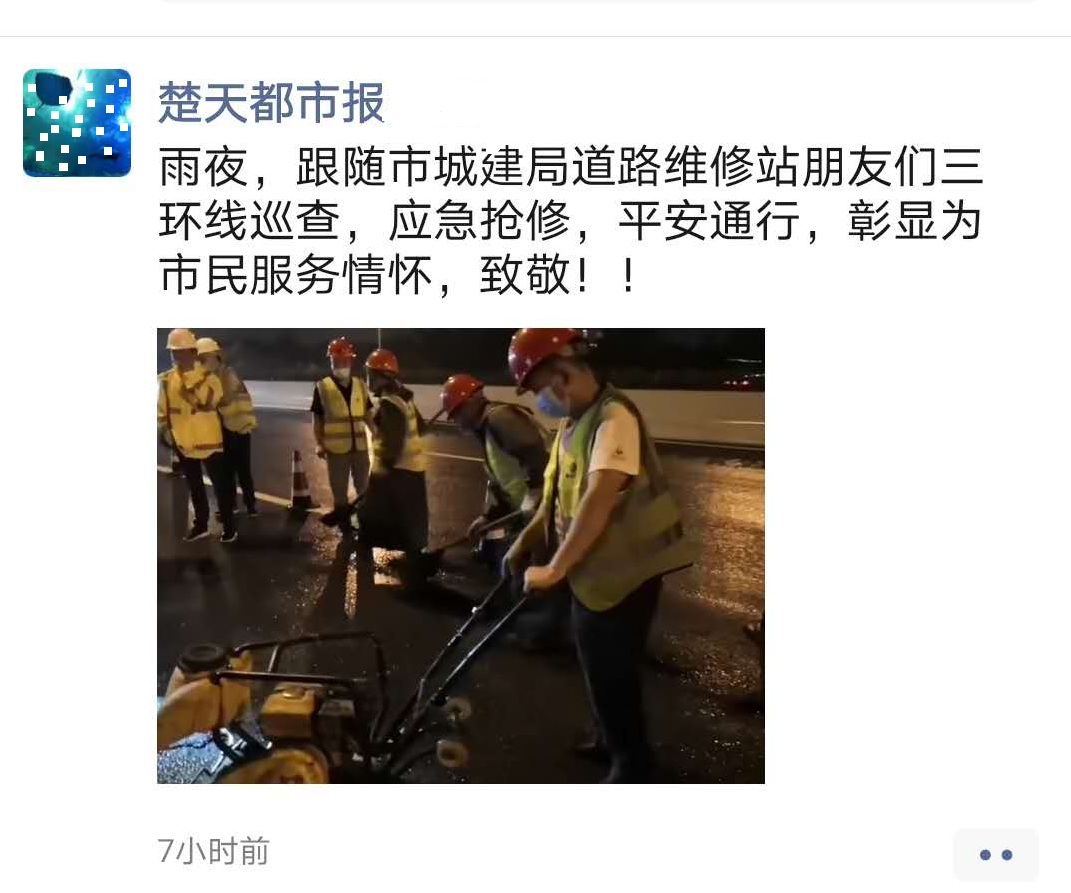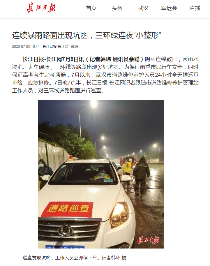 近日,武汉市阴雨连绵,许多路段因雨水浸泡、车辆碾压等出现坑凼,严重影响了交通安全。为保障雨季市民行车安全,助力高考考生赴考通畅,7月以来,汉阳市政六公司24小时全天候巡查排险,提前预防、提前抢修,积极修复受损路段,做到应急抢修不断档,获得了民众的一致好评,并被《长江日报》《武汉晨报》《武汉晚报》《楚天都市报》等主流媒体报道。