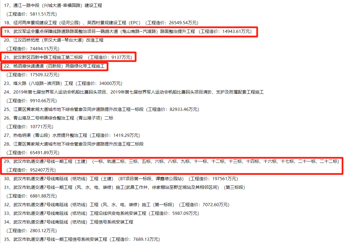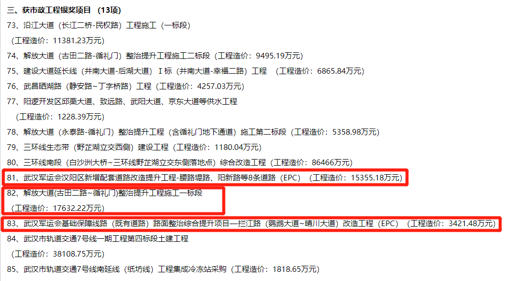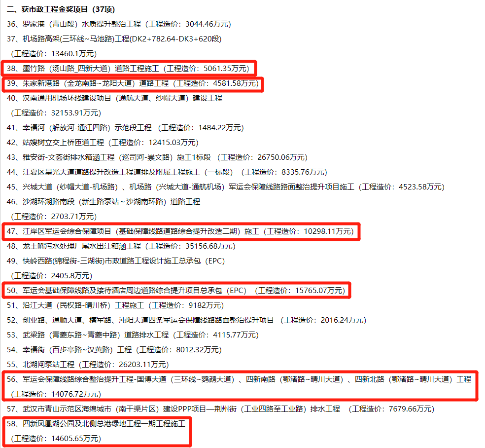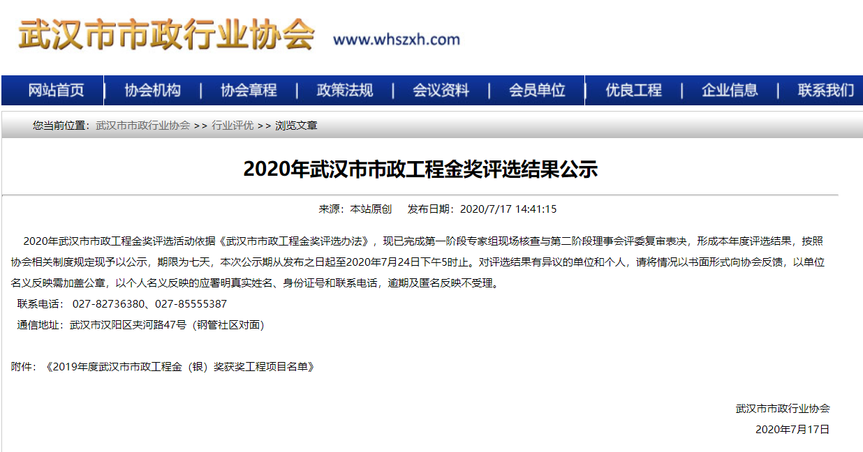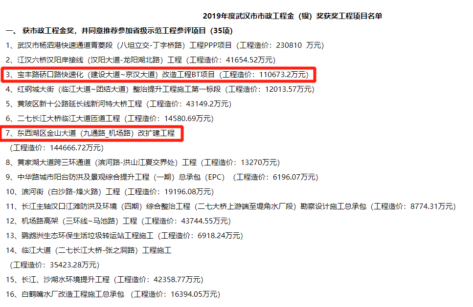 2019年武汉市市政工程金奖入选工程项目名单公示