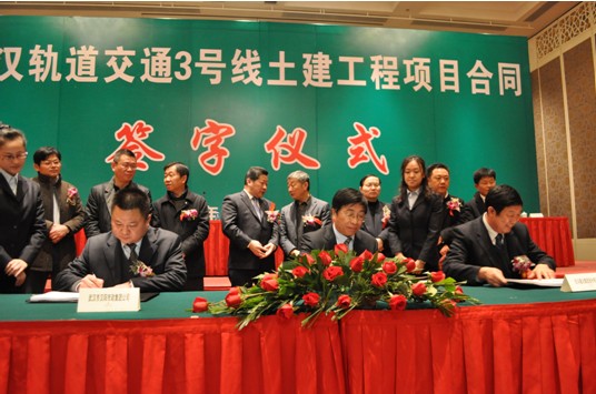 2月16日下午,连通三金潭到沌阳大道的武汉轨道交通3号线一期土建工程项目合同签字仪式在武汉香格里拉大酒店隆重举行,标志着武汉地铁又一条线路进入实质性建设阶段。武汉地铁集团总经理刘玉华与14家中标单位代表签订施工合同,武汉市发改委副主任熊贻沛、市相关部门领导、地铁集团董事长涂和平及其主要领导出席签约仪式。