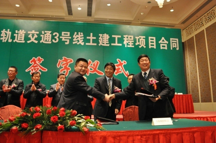集团公司董事长胡红胜同志(左四)出席武汉轨道交通3号线一期土建工程签约仪式