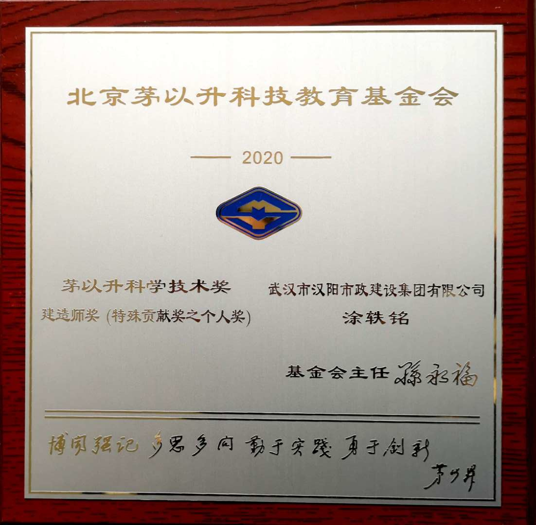 10月24日,由中国工程院、中国铁道学会、中国土木工程学会、北京茅以升科技教育基金会联合主办的“北京茅以升科技教育基金会第29届颁奖大会暨第十届桥梁与隧道工程技术论坛”在北京举行。大会对抗击疫情中为武汉“两山”医院建设做出突出贡献的企业和个人予以表彰,汉阳市政六公司总经理涂轶铭荣获“茅以升科学技术奖——建造师奖(特殊贡献奖之个人奖)”。