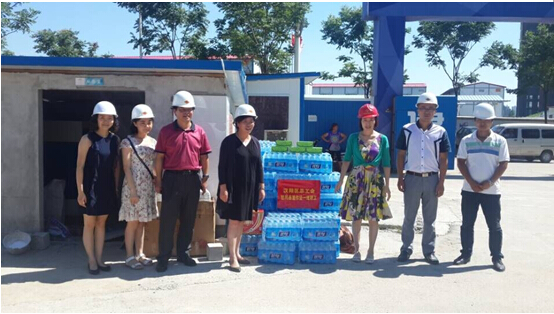 7月29日,骄阳似火,暑热逼人,汉阳区工会喻主席、谢主任等领导来到博宏建设的芳草小学施工现场,向奋战在建设一线的职工送去矿泉水、风油精等夏令防暑物资,向他们送去一份夏日的清凉。