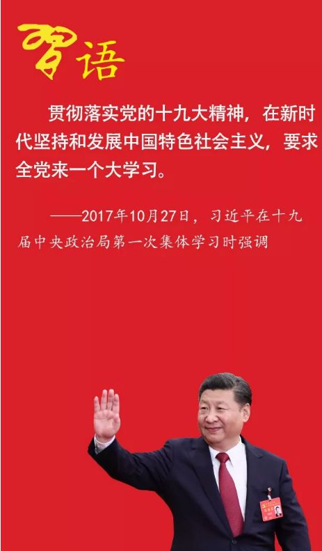 在每一个重大转折时期,面对新形势新任务,我们党总是号召全党同志加强学习;而每次这样的学习热潮,都能推动党和人民事业实现大发展大进步。党的十九大,是在全面建成小康社会决胜阶段、中国特色社会主义进入新时代的关键时期召开的一次十分重要的大会,提出了许多新理念、新论断,确定了许多新任务、新举措,特别是确立了习近平新时代中国特色社会主义思想的指导地位,制定了新时代中国特色社会主义的行动纲领和发展蓝图,进一步指明了党和国家事业前进方向。要使党的十九大精神成为推动党和国家事业发展的强大思想武器,把党的十九大提出的各项目标任务落到实处,就需要在全党来一次大学习。历史证明,全党学习的过程就是思想统一的过程、行动看齐的过程、力量凝聚的过程、事业推进的过程。