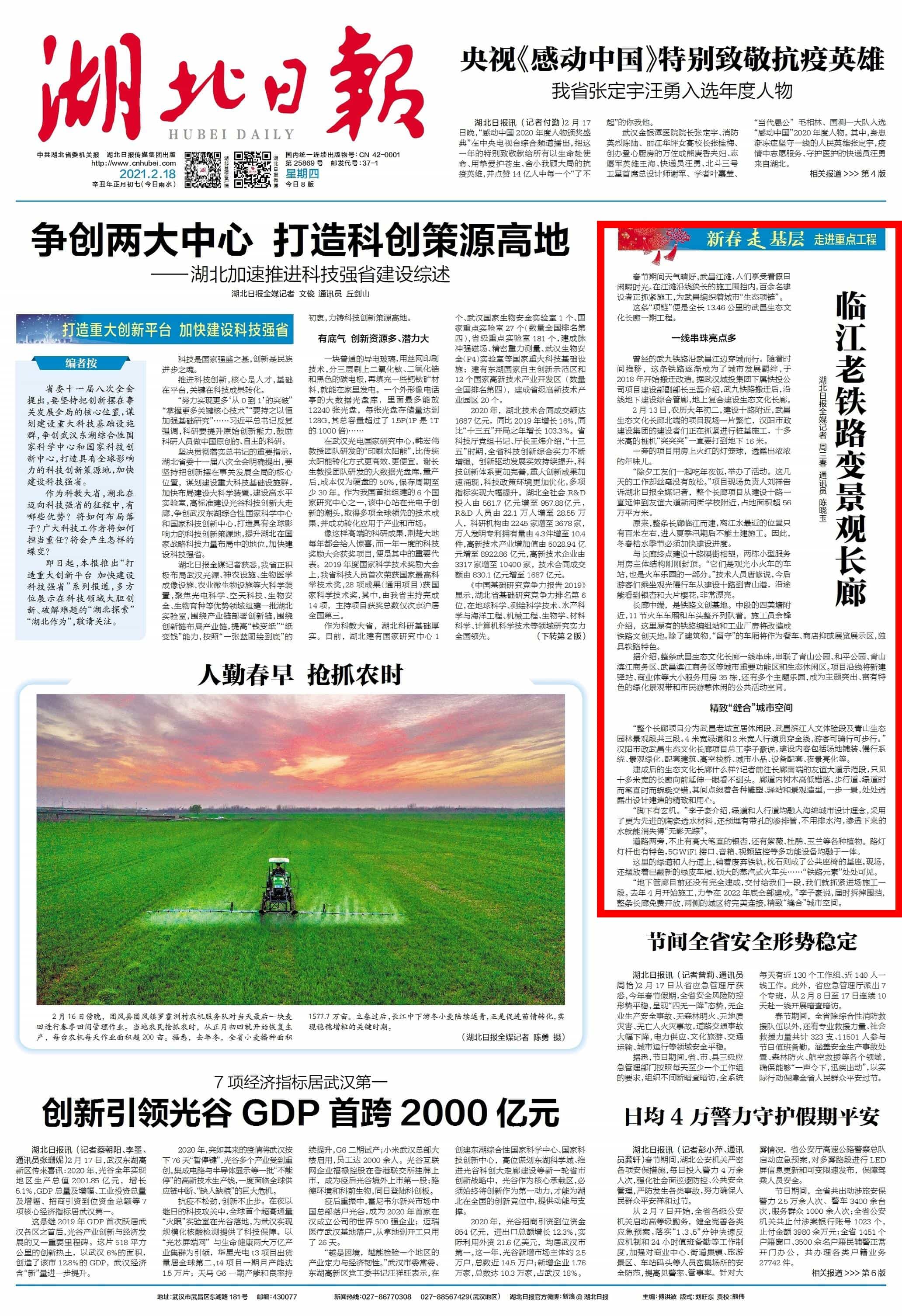 2月18日,大年初七,新年后上班的第一个工作日,湖北日报头版报道汉阳市政在建项目——武昌生态文化长廊施工进展和工程亮点,点赞汉阳市政建设者们利用春节假期抢抓工期,为武昌编织城市“生态项链”。