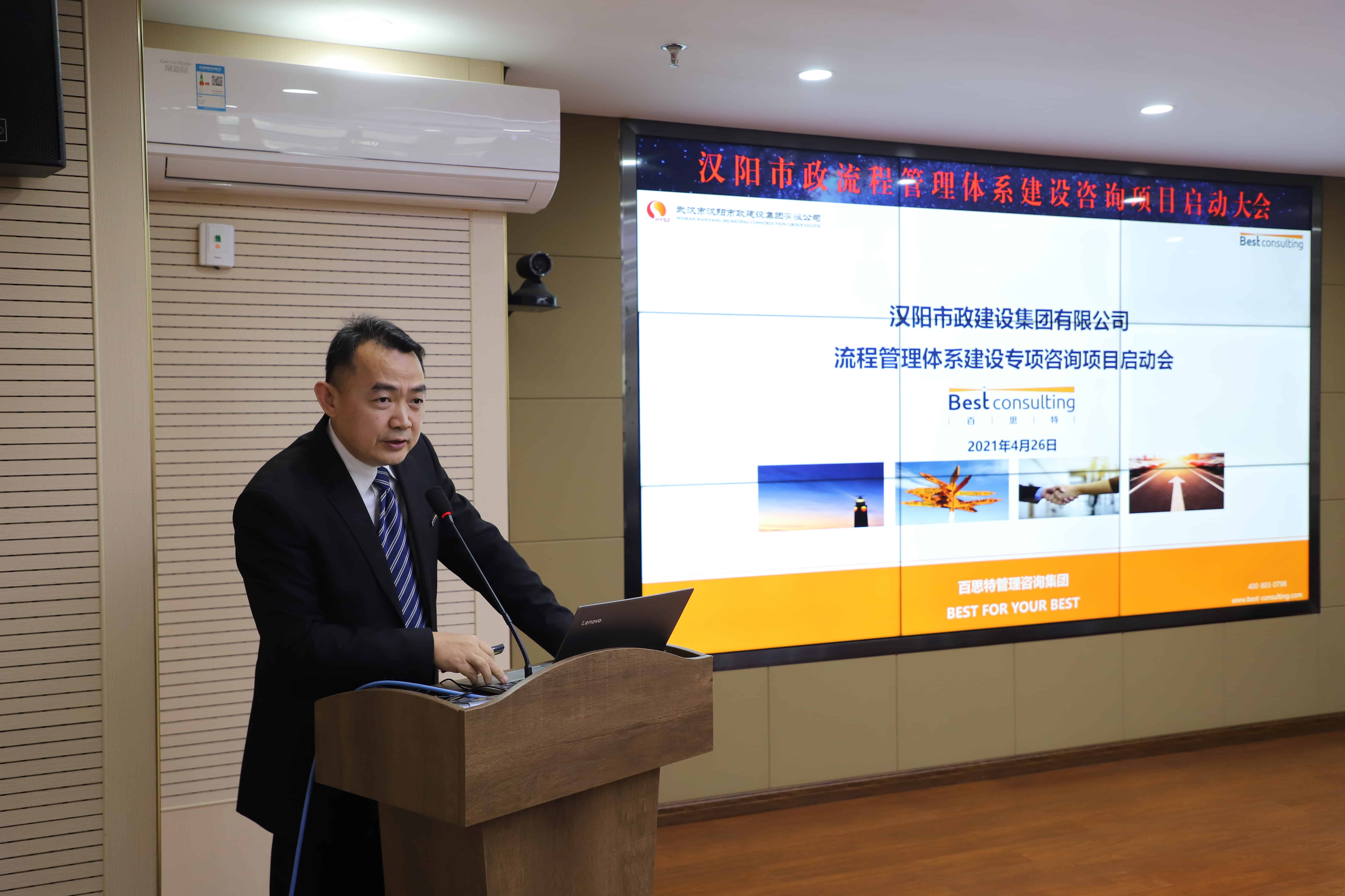 4月26日下午,汉阳市政流程管理体系建设咨询项目启动大会顺利召开。汉阳市政党委书记、董事长严悌文等党委班子成员,各分子公司、机关各部门负责人,以及百思特管理咨询有限公司常务副总裁、变革研究院执行院长孟德强等项目顾问团队参加了会议。会议由集团公司总经理助理冷雪主持。