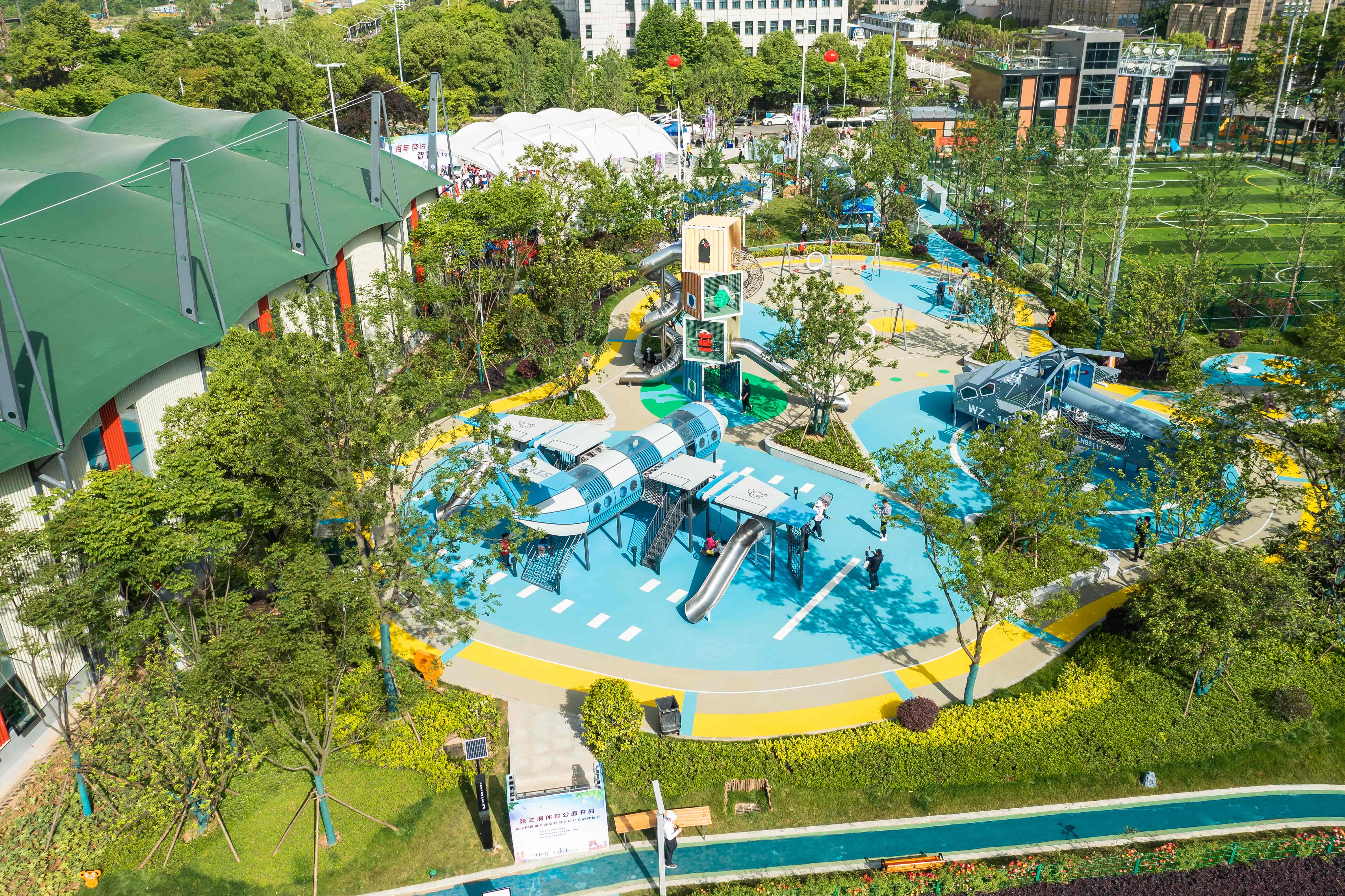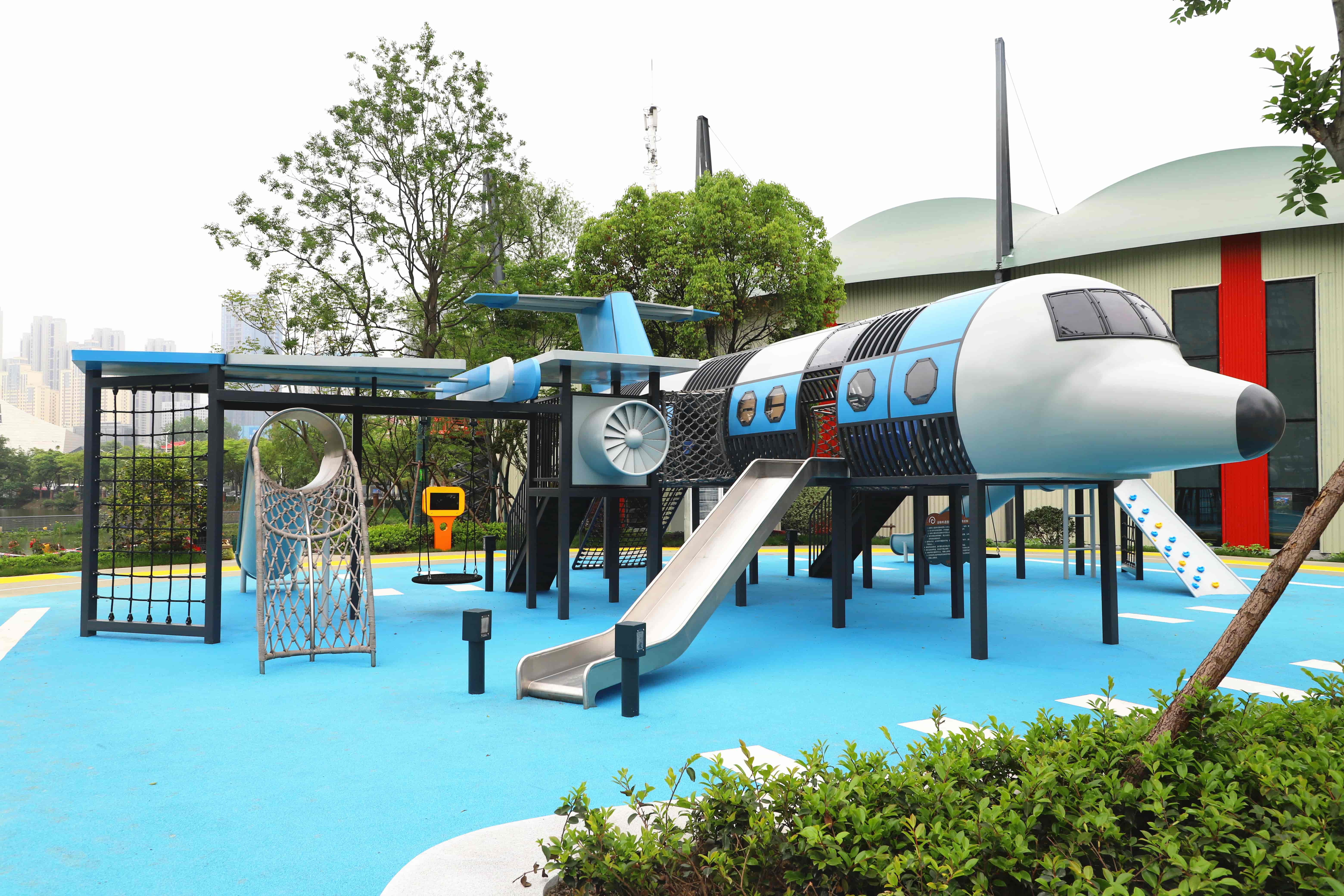 在公园的中间地带,是儿童和青少年活动区。这里有直升机、运输机等形状的游乐设施,还有各色的卡通动画秋千及座椅,既融入了军事元素体现张之洞文化,又富有童心,展现了青春与活力。