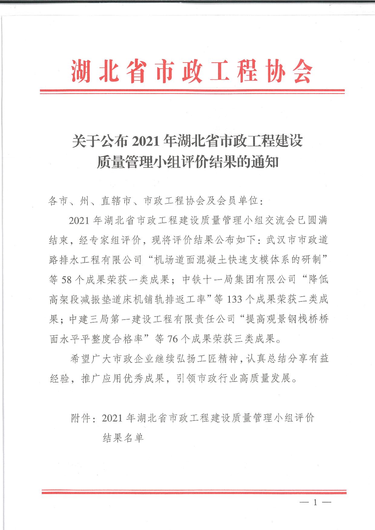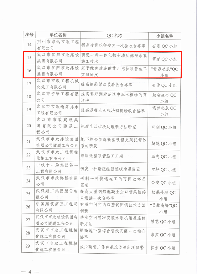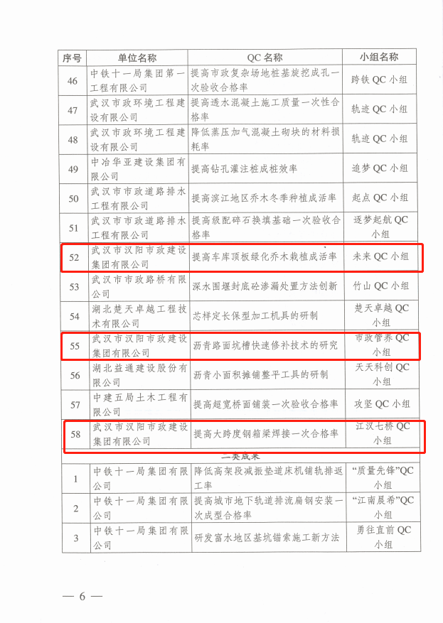 汉阳市政多项QC成果荣获湖北省市政工程协会奖项
