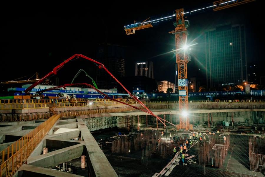 凌晨,在中南科研设计中心项目的施工现场,灯火通明,工人们正在有序工作。