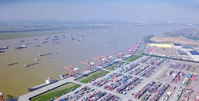 航拍长江上货船往来,码头上集装箱摆放有序(来源:新华网)