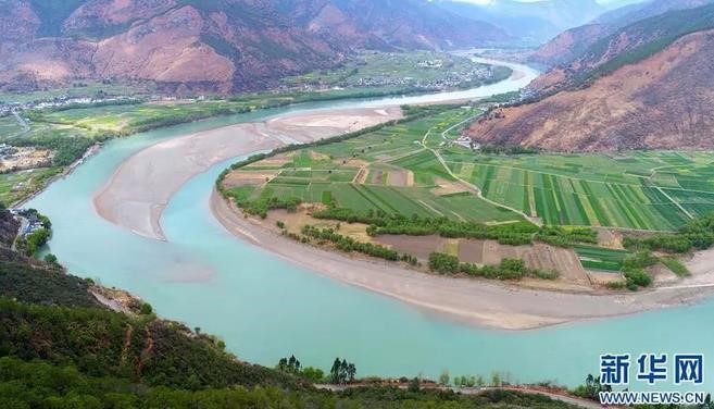 云南省丽江市石鼓镇绿树和农田掩映下的“长江第一湾”(来源:新华网)