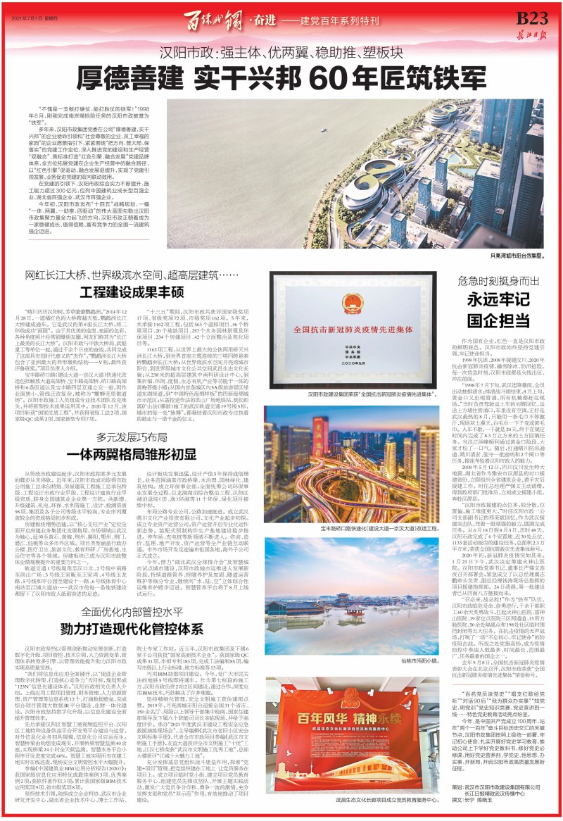 7月1日,长江日报专版报道汉阳市政,推出《厚德善建 实干兴邦 60年匠筑铁军——汉阳市政:强主体、优两翼、稳助推、塑板块》专版报道,聚焦汉阳市政发展史,展现汉阳市政为城市发展做出的贡献。