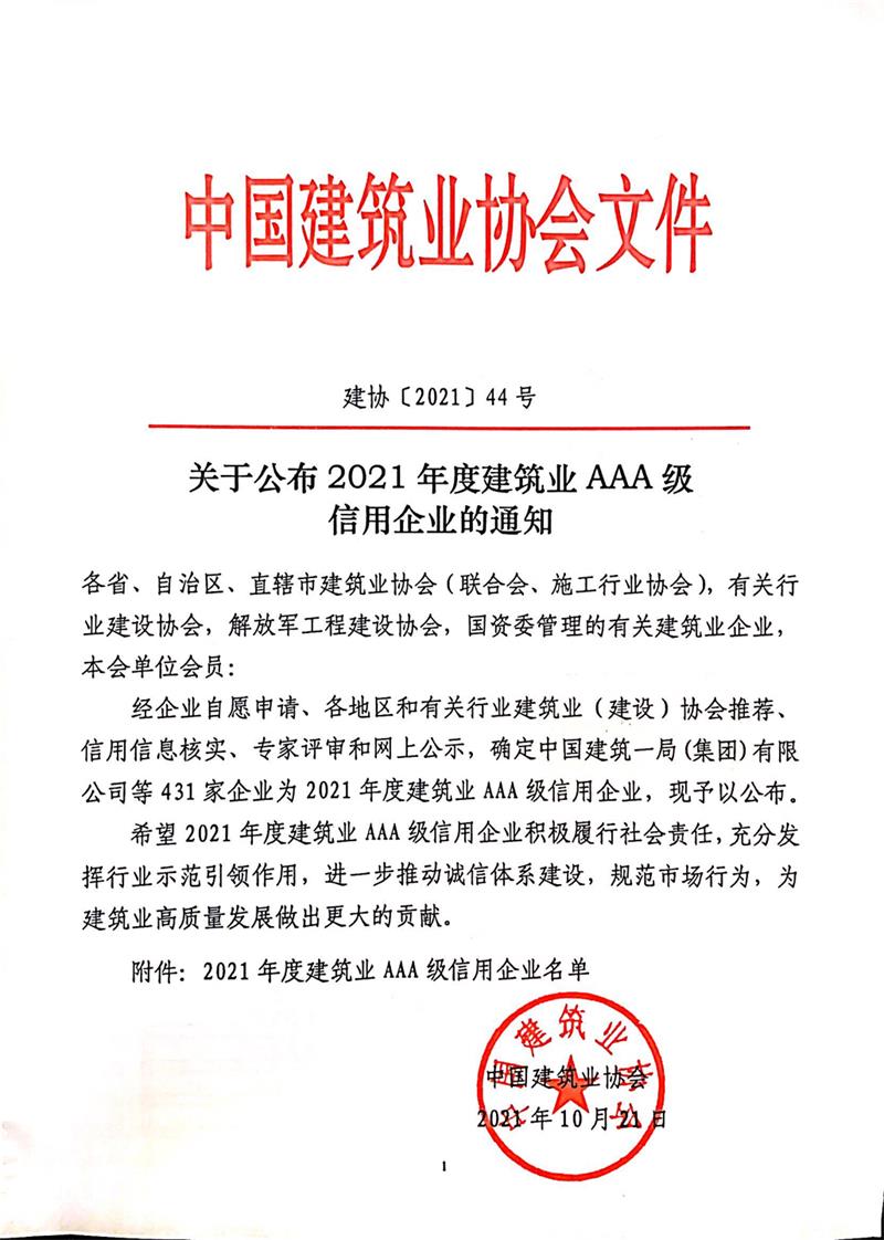 全国建筑业AAA级信用企业是以企业基本素质、经营能力、财务指标、管理指标、竞争力指标、市场行为指标等多项指标进行综合评估,评估总分90分(含)以上的企业入选AAA信用等级企业。并分为AAA、AA、A、B、C三等五级。AAA企业为信用企业的最高级,表示受信单位诚信度很高,各项指标优秀,企业素质很高,诚信意识强、经营状况好、履约能力强、社会信誉好。