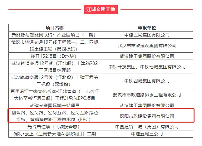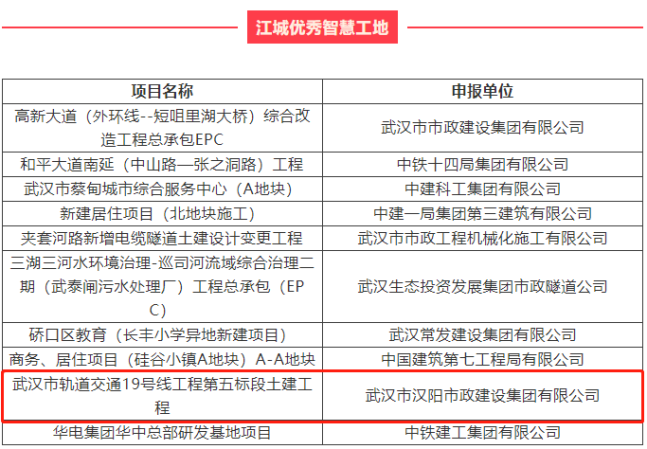近日,由楚天都市报、武汉建筑业协会、武汉市建筑行业工会联合会联合主办的2021年“创领智控杯”江城“双十大”选树结果揭晓,汉阳市政高新三路(三环线-外环线)改造提升工程总承包(EPC)获评“江城十大智慧工地”,创智路、径河路、径河五路、径河五路跨径河桥、黄狮海东路工程总承包(EPC)获评“江城文明工地”,武汉市轨道交通19号线工程第五标段土建工程获评“江城优秀智慧工地”。
