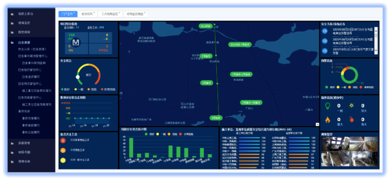 通过物联网平台将现场硬件数据实时同步到平台中,展示现场环境PM2.5、噪声、风速、温度、湿度等状态,生成各项环境指标趋势图,自定义预警值,远程控制设备。项目内部设有劳务班组人员实名制系统,进退场人员实时更新,并对接武汉市实名制管理平台,接受劳务人员进场及上下班打卡监管。利用手机端安全管理系统,由责任人对问题进行整改回复,记录人对问题进行复核,使问题形成闭环,自动生成整改通知单、罚款单、安全日志,提高一线工作人员工作效率。基于施工现场虚拟危险源特点让体验者可以走进真实的虚拟现实场景中,通过沉浸式和互动式体验让体验者得到更深刻的安全意识教育,提升全员生产安全意识水平,具有科技应用水平高、培训成效好、安装部署快,使用成本低等显著特点。与建设单位、监理单位协同使用武汉地铁质量安全管理平台,实现施工现场视频监控、隐患排查、应急管理、质量管理及视频会商一体化协同管理。