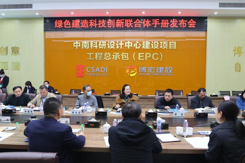 12月15日,绿色建造科技创新联合体手册发布会在汉阳市政中南科研设计中心建设项目举办,该手册打通行业上下游企业壁垒,为湖北省房建与市政工程领域设计与施工全过程提供技术指导。湖北省住房和城乡建设厅党组成员、副厅长龙宁,武汉市城乡建设局副局长、建管办主任周才志,汉阳区政府副区长蔡松等莅临指导。汉阳市政党委书记、董事长严悌文,总工程师荆武等出席了此次会议。