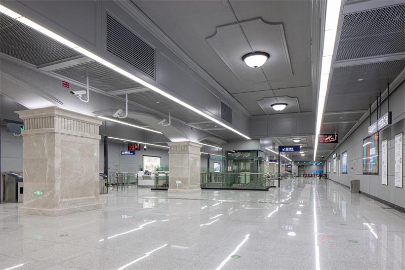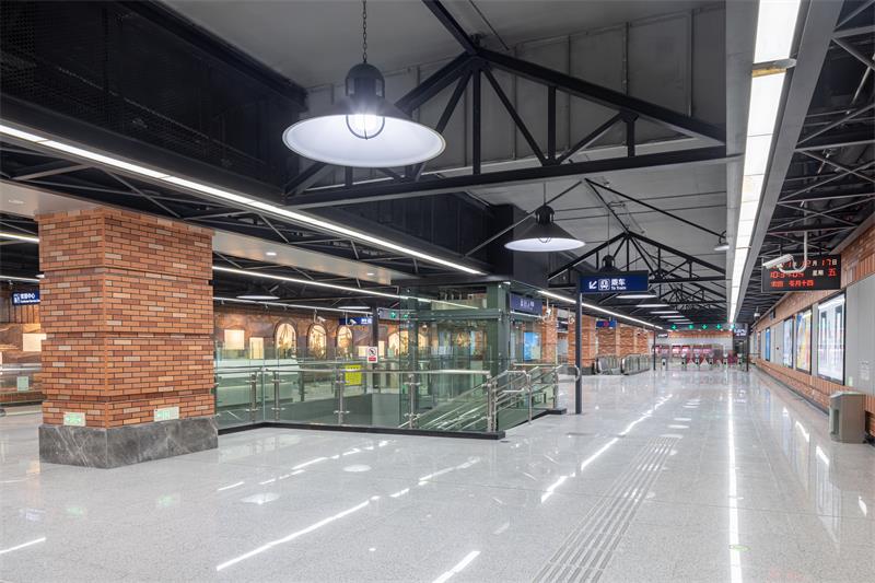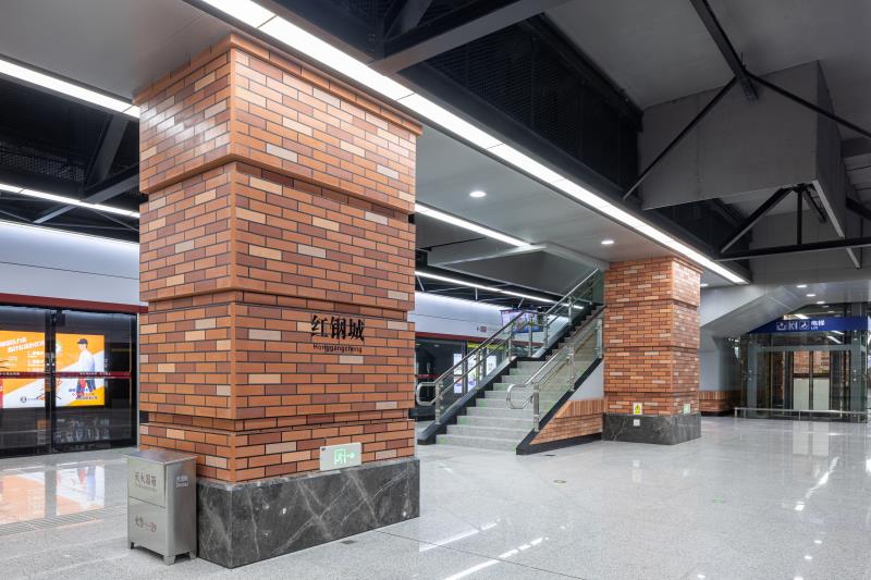 红钢城站以“红城岁月”为主题,从红钢城的原始风貌入手,车站立柱提取“红房子”红砖元素,采用仿红砖质感的高强纤维板进行仿制,墙面还原老建筑形态,上下采用红色仿制砖,中间区域采用灰色的高强纤维水泥板,以打造怀旧的老武汉岁月感。车站照明灯具设计结合了极富工业元素的工矿灯,旨在将地铁空间融入周边环境,凸显老武汉的街景特色。
