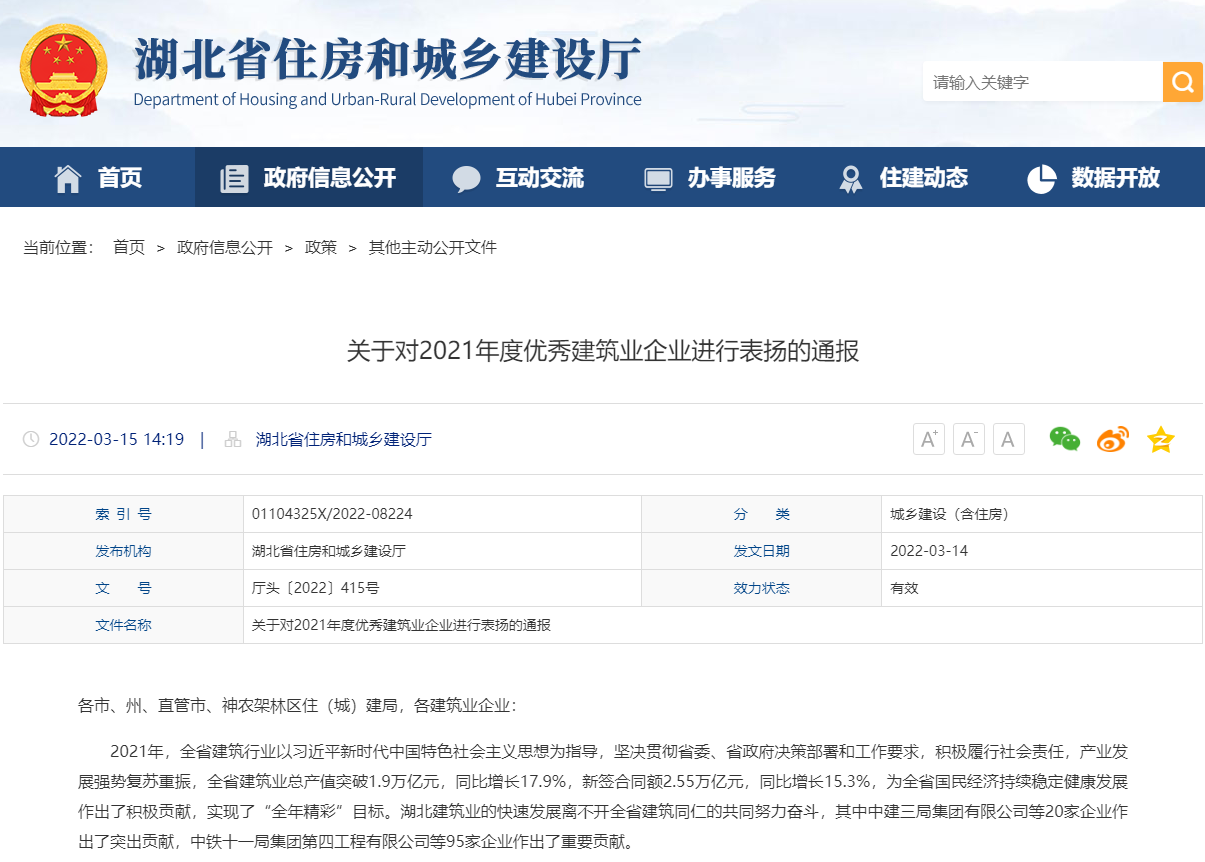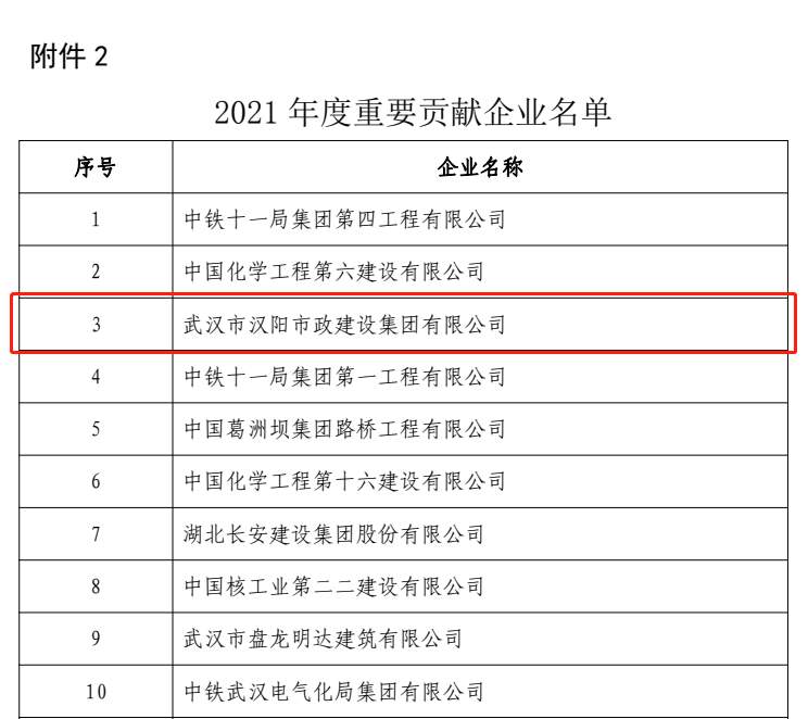3月15日,湖北省住建厅公布115家优秀建筑业企业名单,揭晓2021年度突出贡献企业和重要企业评选结果,汉阳市政获评“2021年度重要贡献企业”,获通报表扬。