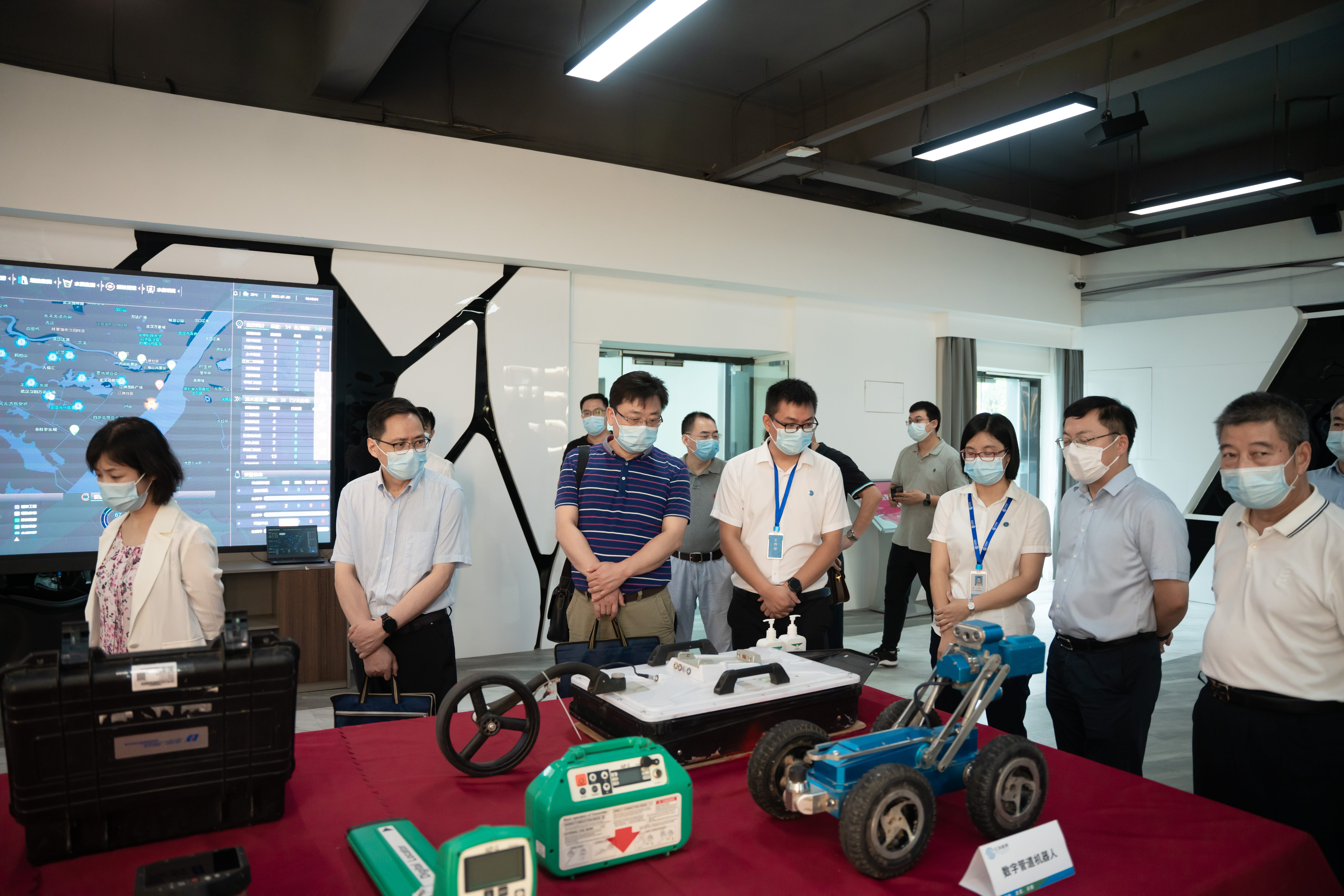 调研组一行首先参观了检测公司的实验区,在讲解员的介绍下了解了道路综合检测车、三维雷达探测车以及落锤车的基本工作原理。随后,调研组体验了房屋巡查体感操作系统,近距离参观了数字管道机器人、TZ12全站仪、经纬 M300 RTK、禅思P1等一批高新设备。汉阳市政检测公司始终聚焦智能化检测,大力引进核心技术和高新人才,拥有一大批先进的检测设施和完备的资质参数。十四五以来,坚定不移地贯彻落实十四五规划精神,将提质增效作为企业发展首要目标,在今年还取得了湖北省“专精特新”企业称号。