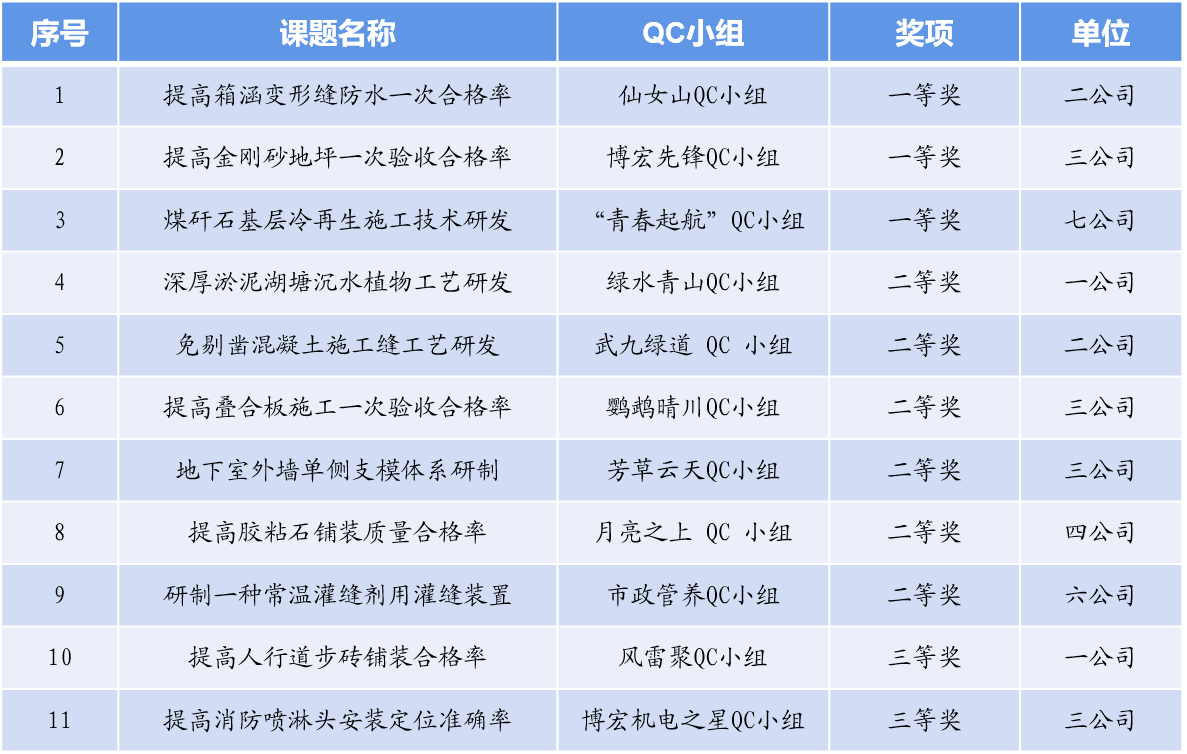 近日,由中国施工企业管理协会主办的2022年度工程建设质量管理小组活动复赛和决赛顺利落幕,汉阳市政选送的11项优秀QC成果在全国参赛成果中脱颖而出,均斩获大奖。其中3项成果荣获一等奖,6项成果荣获二等奖,2项成果获三等奖。这是公司首次获得该类成果一等奖,标志着工程质量管理再上新台阶。