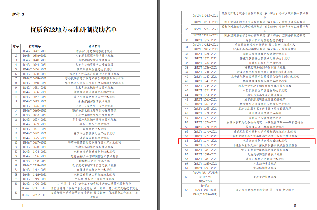 汉阳市政入选此次优质省地标为(《建筑垃圾再生集料水泥混凝土道路应用技术规程》DB42/T 1775-2021、《泡沫沥青温拌混合料路面技术规程》DB42/T 1777-2021),主要涉及混凝土和沥青材料的推广应用,标志着公司在垃圾资源化利用和泡沫沥青的应用推广等方面得到行业认可,达到省内领先水平,具有较高的推广应用价值,为将来在道路工程的新材料与绿色技术的研发和推广提供有力支撑。