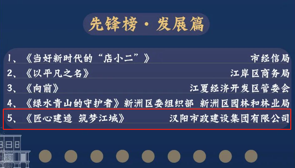 本次大赛共有565部作品参赛,经专家评审会三次双月赛和年度赛评选,将制作水平较高,生动反映武汉市党建引领基层治理创新实践成果的30部作品,评为年度先锋作品。汉阳市政党委选送的作品《匠心建造 筑梦江城》荣列其中,该作品由博宏公司具体负责策划摄制。