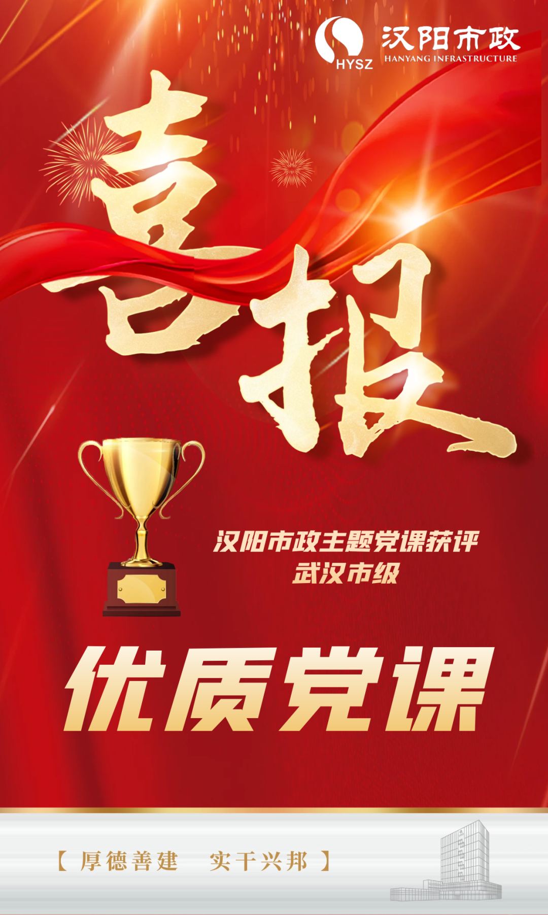 近日,武汉市委组织部发布了《关于2022年度全市“党课开讲啦”暨“主题党课我来讲”活动市级优质党课的通报》,对50场市级优质党课进行表彰。汉阳市政选送的《赓续红色血脉 扛起时代担当》在全市推荐申报的30200场党课中脱颖而出,荣获优质党课优秀奖!