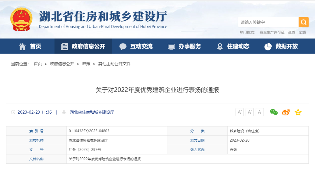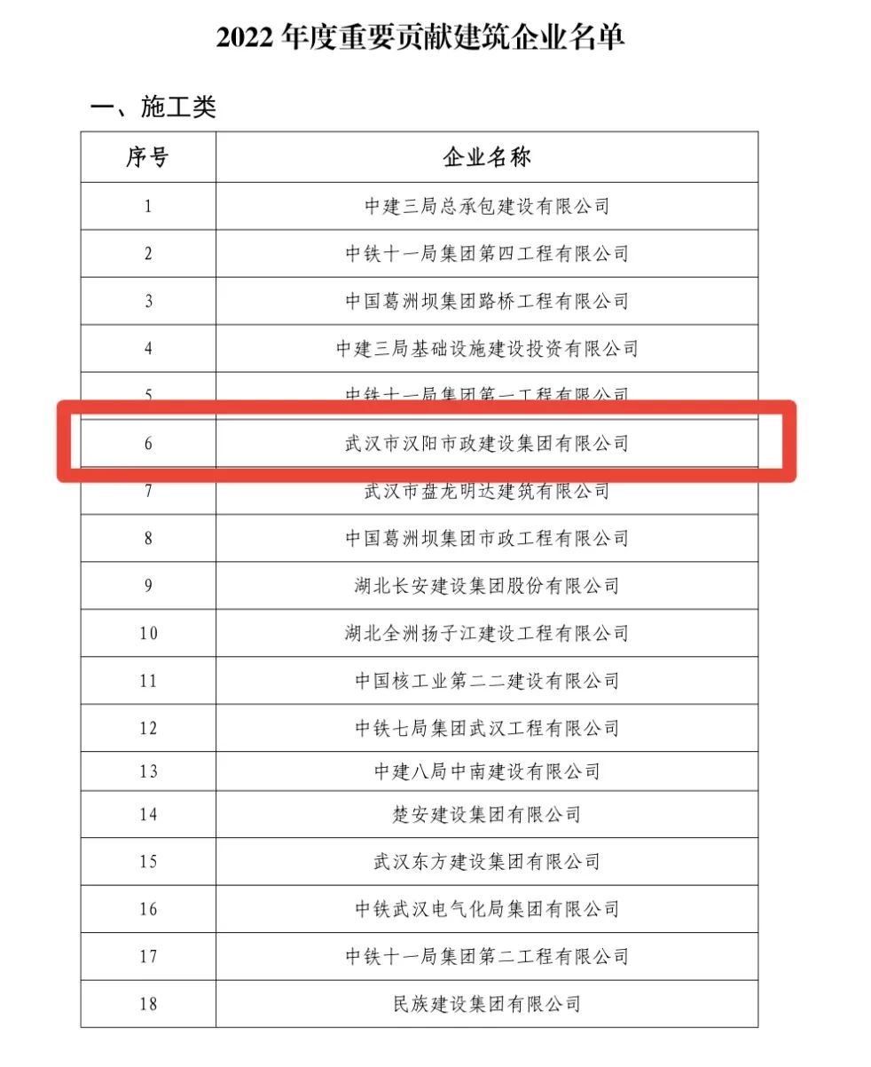 2月23日,湖北省住房和城乡建设厅召开全省建筑业发展与管理工作会议,会上通报表扬26家突出贡献企业和114家重要贡献企业。汉阳市政榜上有名,获评“湖北省2022年度重要贡献建筑企业”。