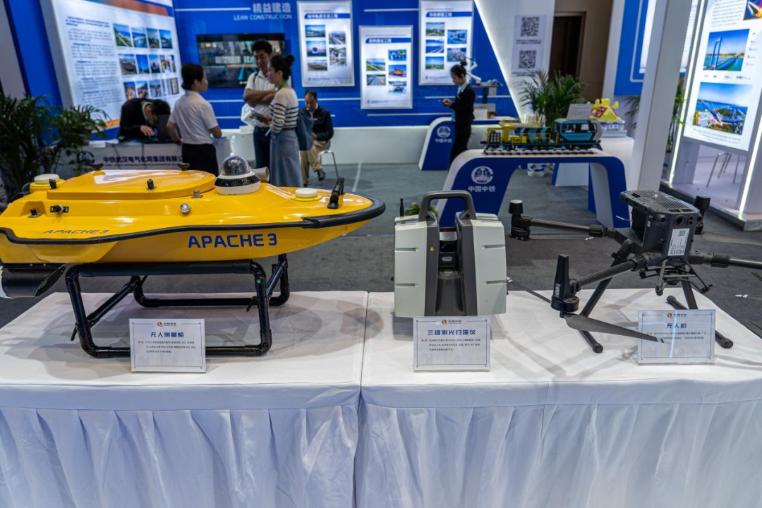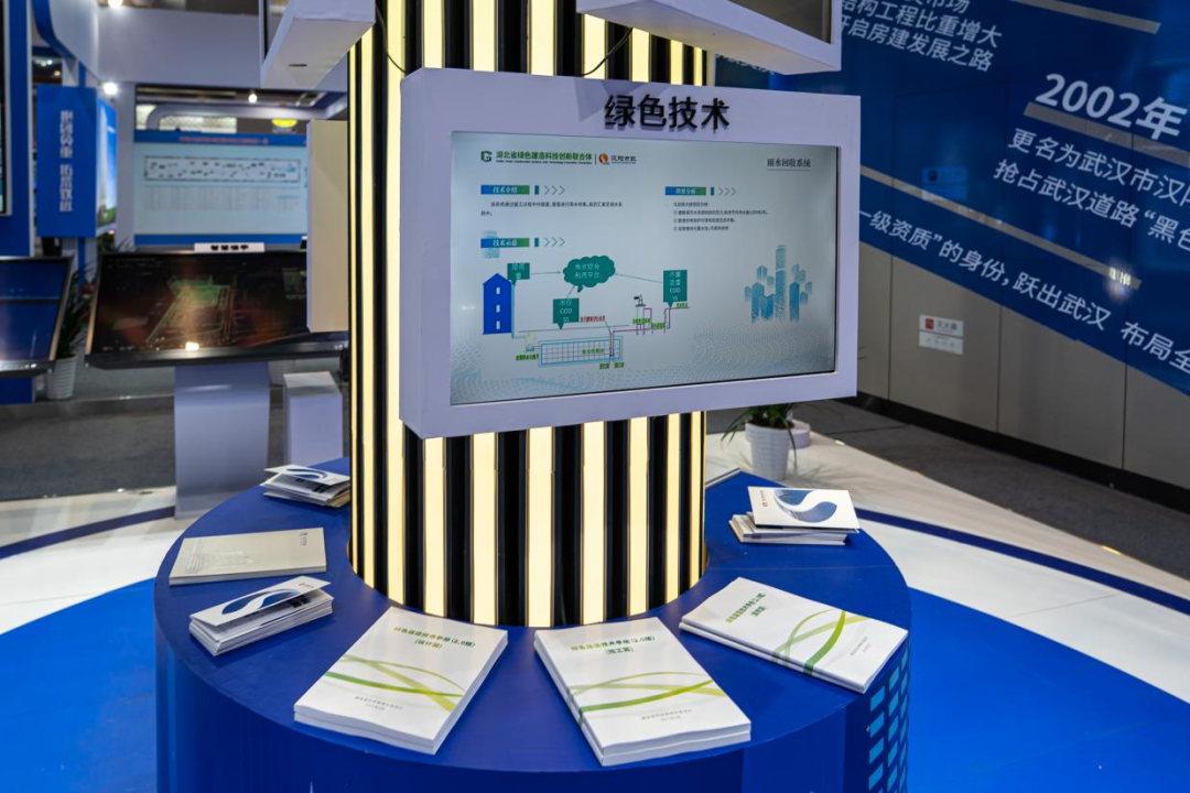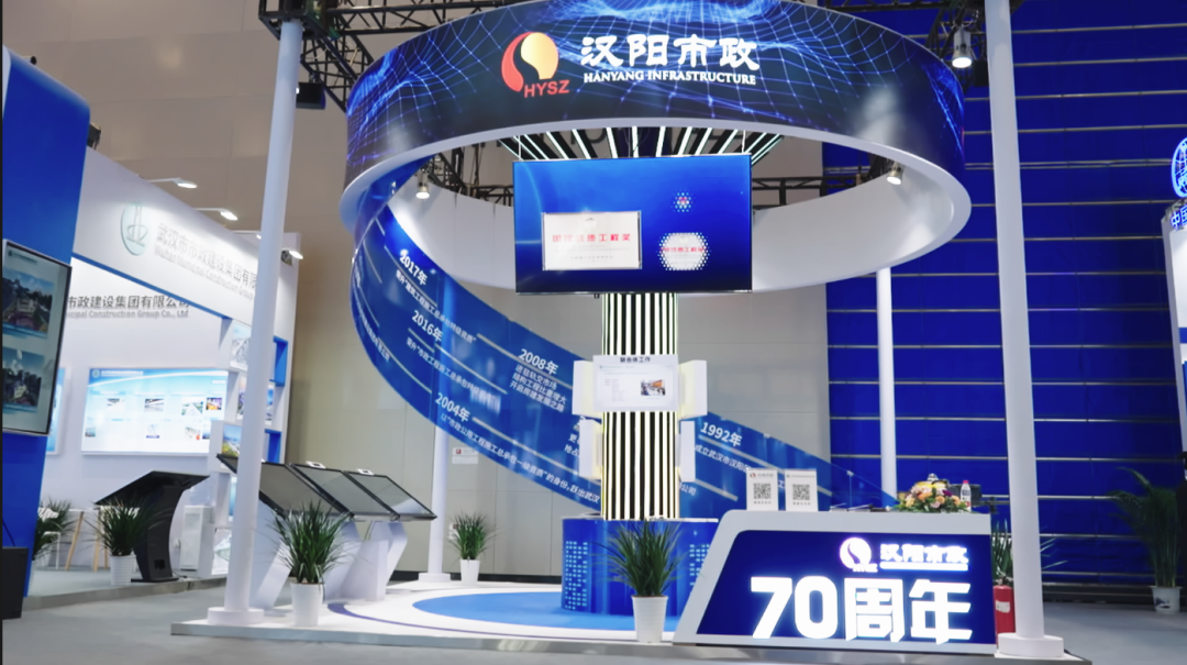 汉阳市政展区以绿色建造、智能建造为主题,分享集团数字化转型的成果。本次展览告别传统展陈形式,以汉阳树为灵感,树冠处连接飘带,增添灵动感,大面积采用科技蓝、白色来点缀,营造不一样的活力氛围。展区以汉阳树为中心,展示了公司70年发展历程、取得的重点业绩和荣誉奖项、联合体工作、绿色技术、绿色产业,以及企业数字化转型、CIM基础平台建设等内容。