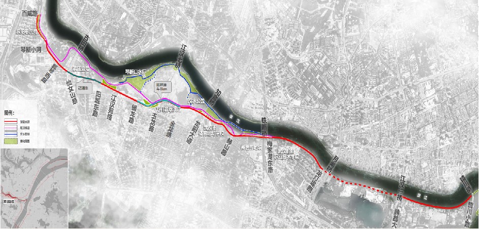 汉水碧道改造提升工程包含新建及提升琴断口水厂上游至月湖桥段碧道,碧道总长约5.77km,标准段宽4.5m,面积约3.27万㎡;修整汉江村民垸堤,重建堤顶道路长约1.85km;在碧道沿线和琴韵码头等8个节点新建和提升绿化约23.59万㎡;提升晴川阁-琴川小路段1.53km碧道及绿化约1.74万㎡;新建汉水公园段护岸。同步建设驿哨、给排水、亮化、公共广播及监控等配套设施。