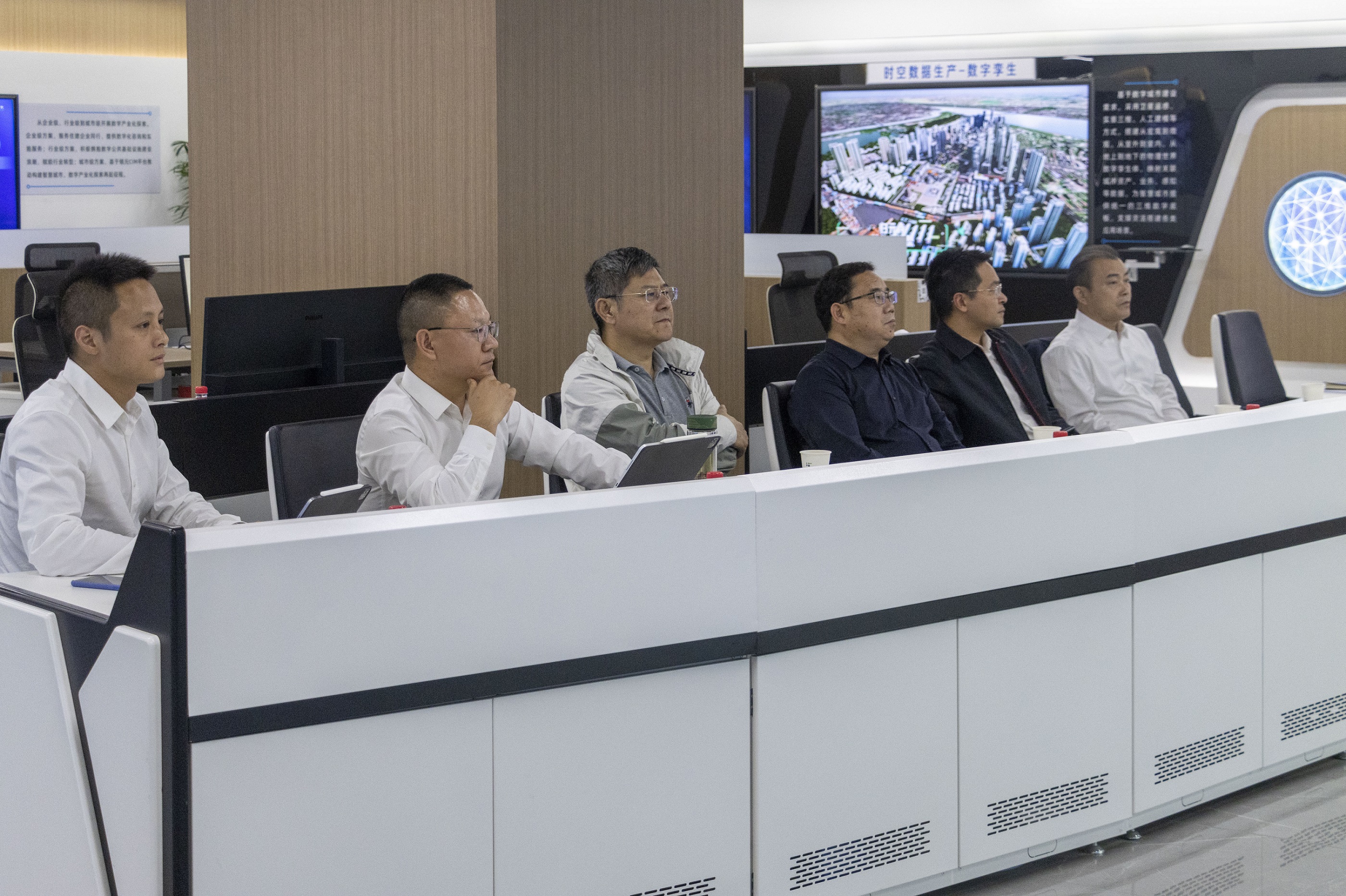 在智能化展厅,一行人了解了汇科智创公司在智能建造、城市运维两大领域的多项先进智能化设备,以及结合设备打造的装配式一体化数字孪生沙盘,一端信号触发两端同步感应等技术。