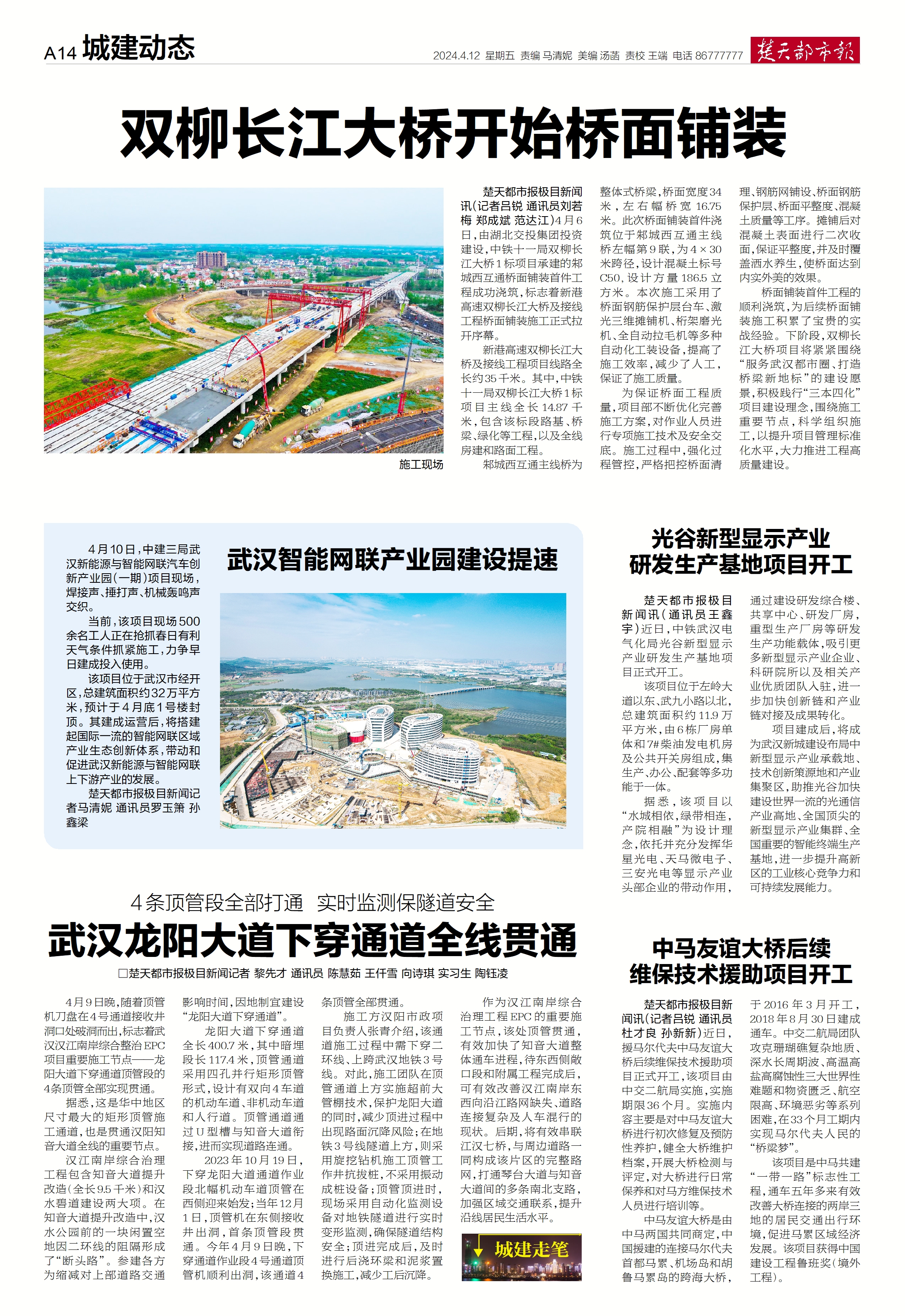 楚天都市报推出《双柳长江大桥开始桥面铺装》专版报道。