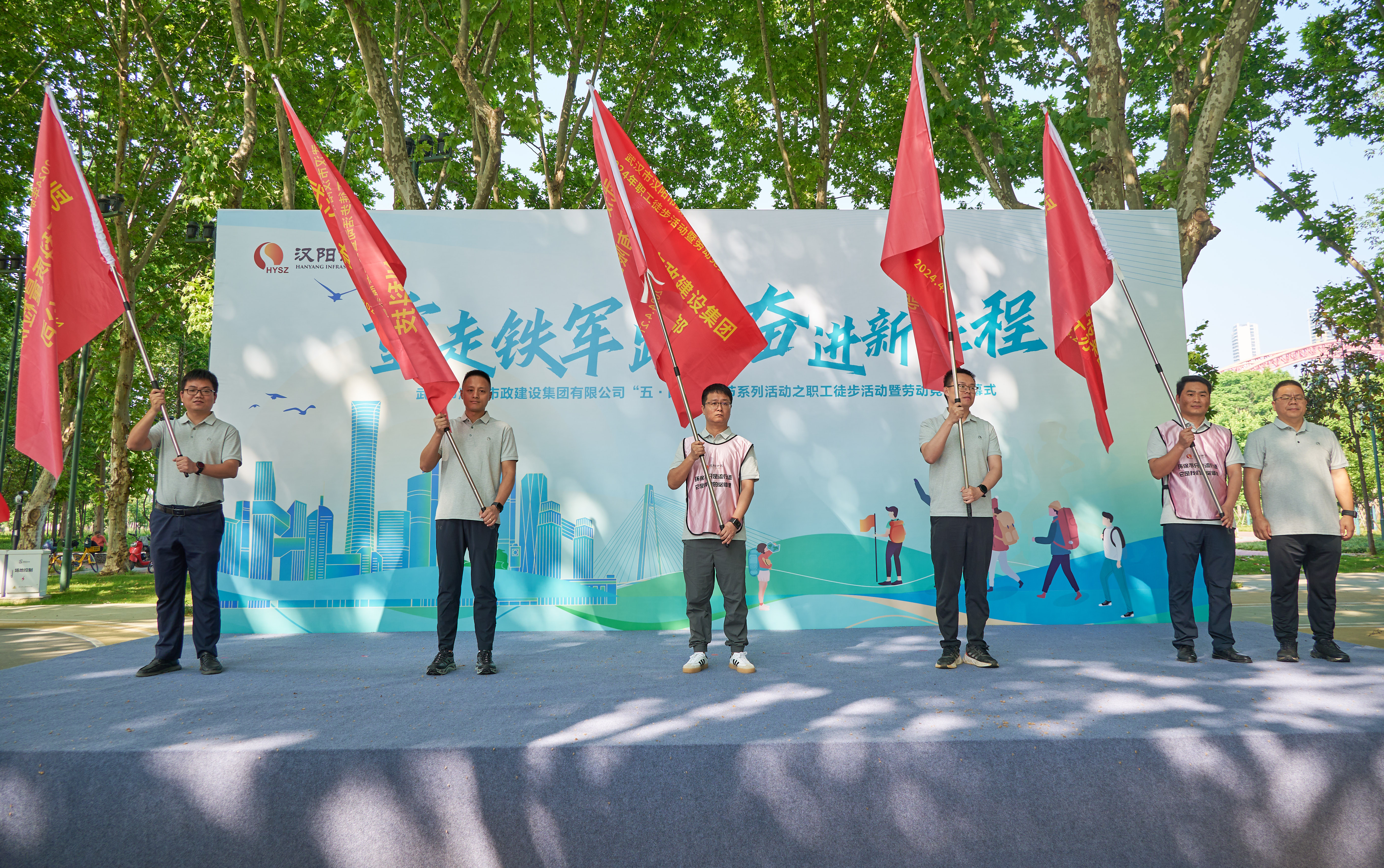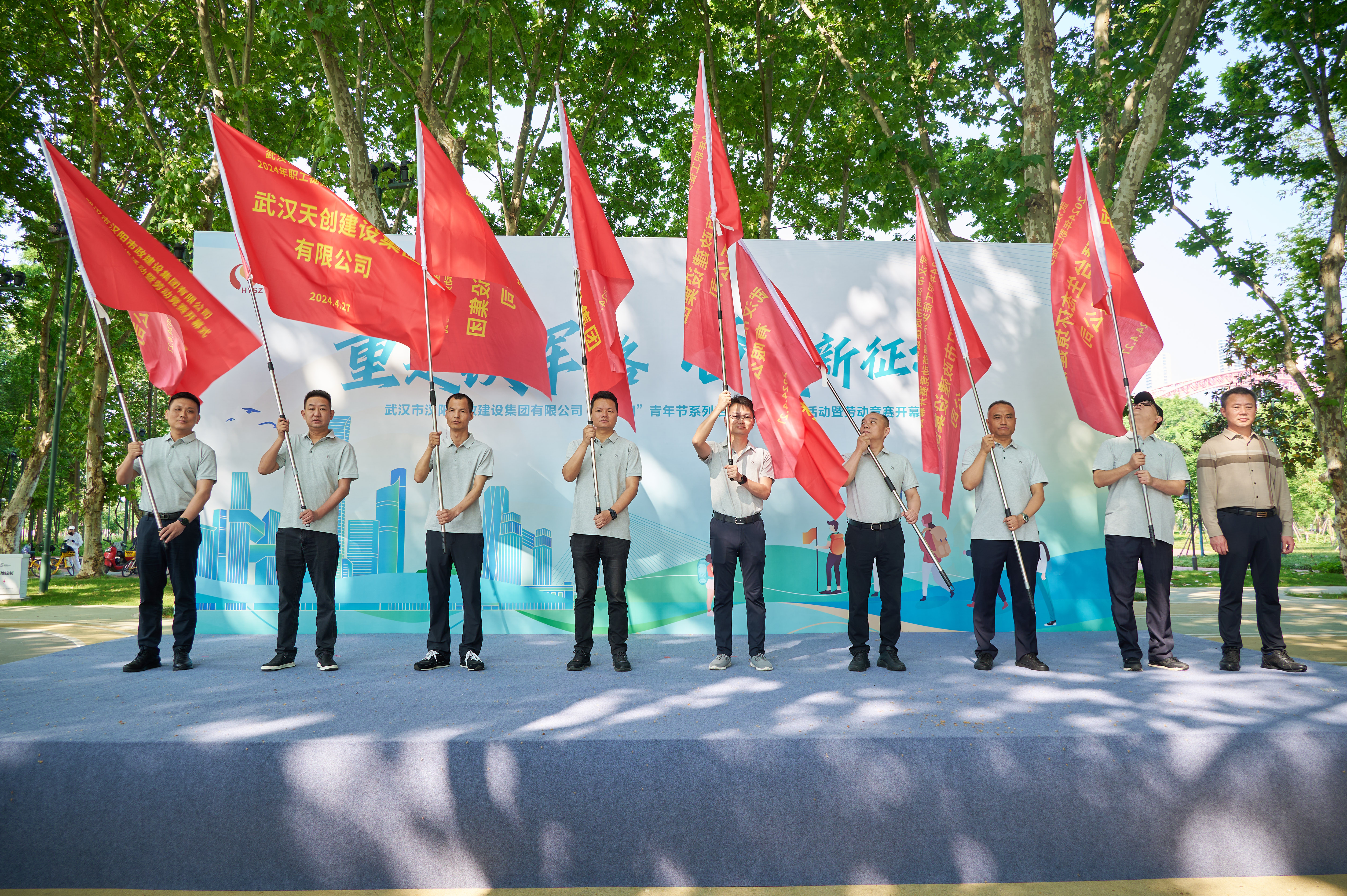 汉阳市政副总经理方紫微、总工程师卢永红为13家劳动竞赛参与单位代表授旗,旗帜高高飘扬,现场气氛热烈高涨。