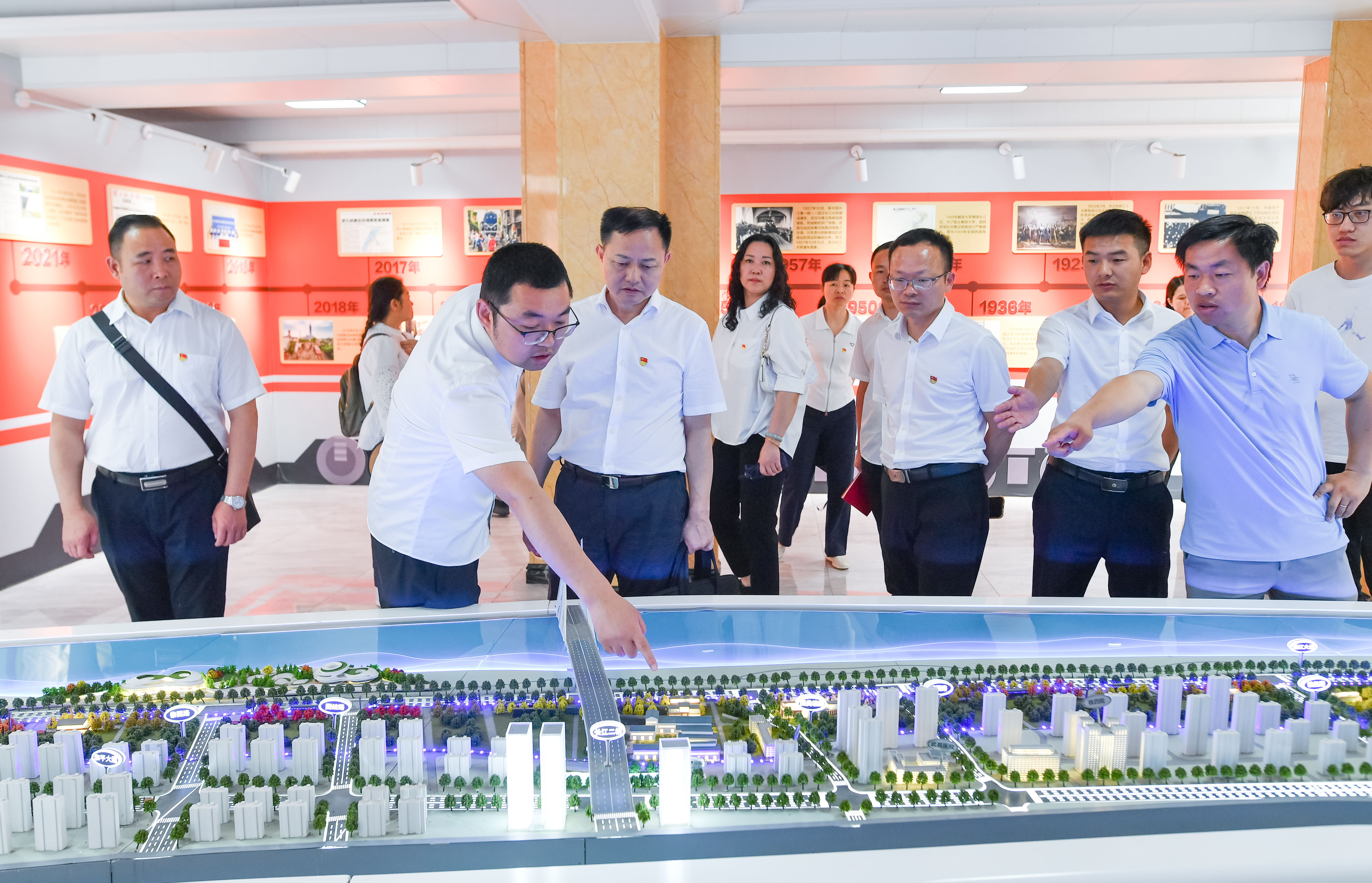 通过观看项目建设沙盘,大家进一步加深了对武昌生态文化长廊项目建设总体情况的了解,并跟随讲解员的步伐,一睹项目党建风采。