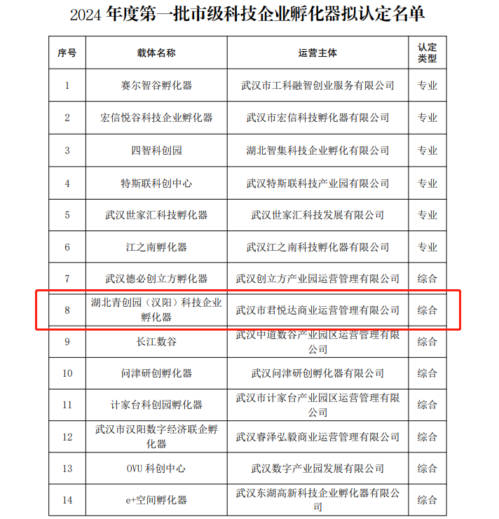 近日,武汉市科技创新局公示了《2024年度第一批市级科技企业孵化器认定和众创空间备案名单》,武汉市君悦达商业运营有限公司运营的湖北青创园(汉阳)科技企业孵化器榜上有名,这不仅是园区发展历程中的重要里程碑,更是对武汉市君悦达商业运营有限公司专业运营实力的最佳注解。